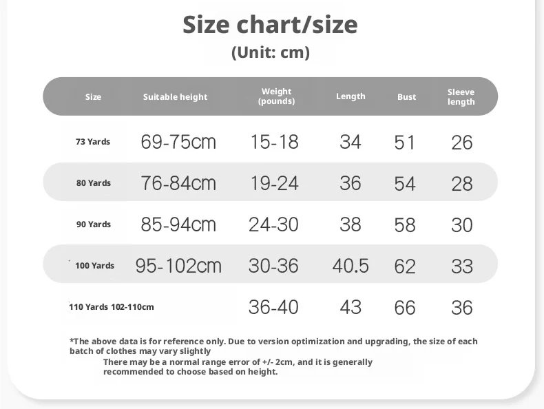 Size 100: age: 2-3 years; weight: 15-17kg ; height: 95-102cm