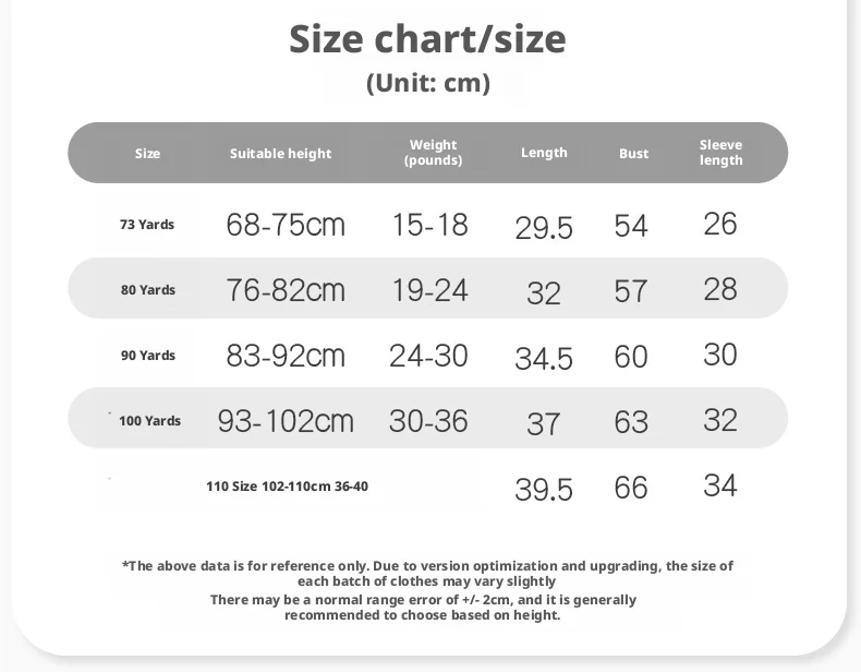 Size 100: age: 2-3 years; weight: 15-17kg ; height: 95-102cm