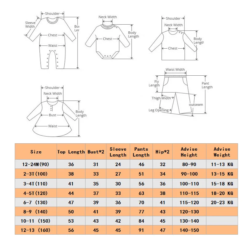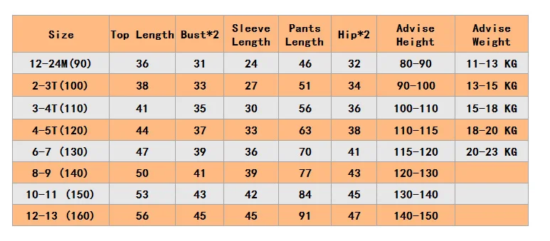 160 Tops Length:56cm bust:45*2cm Sleeve:45cm Pants:91cm Age:12-13T