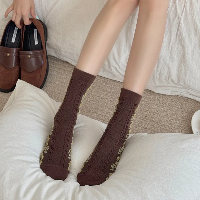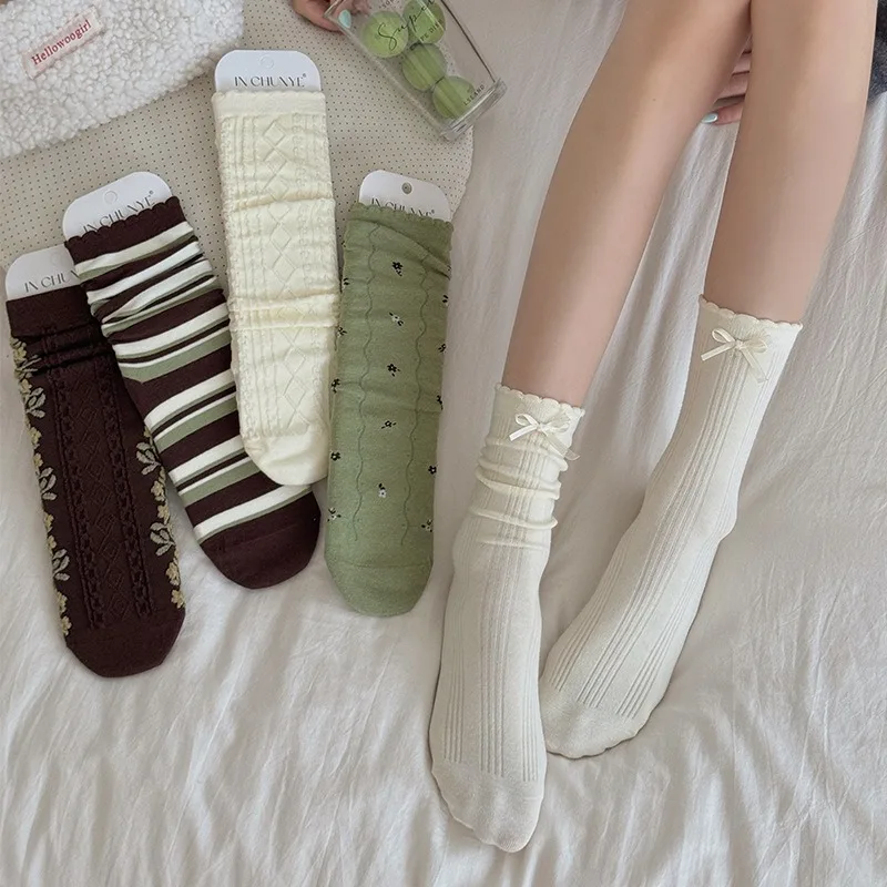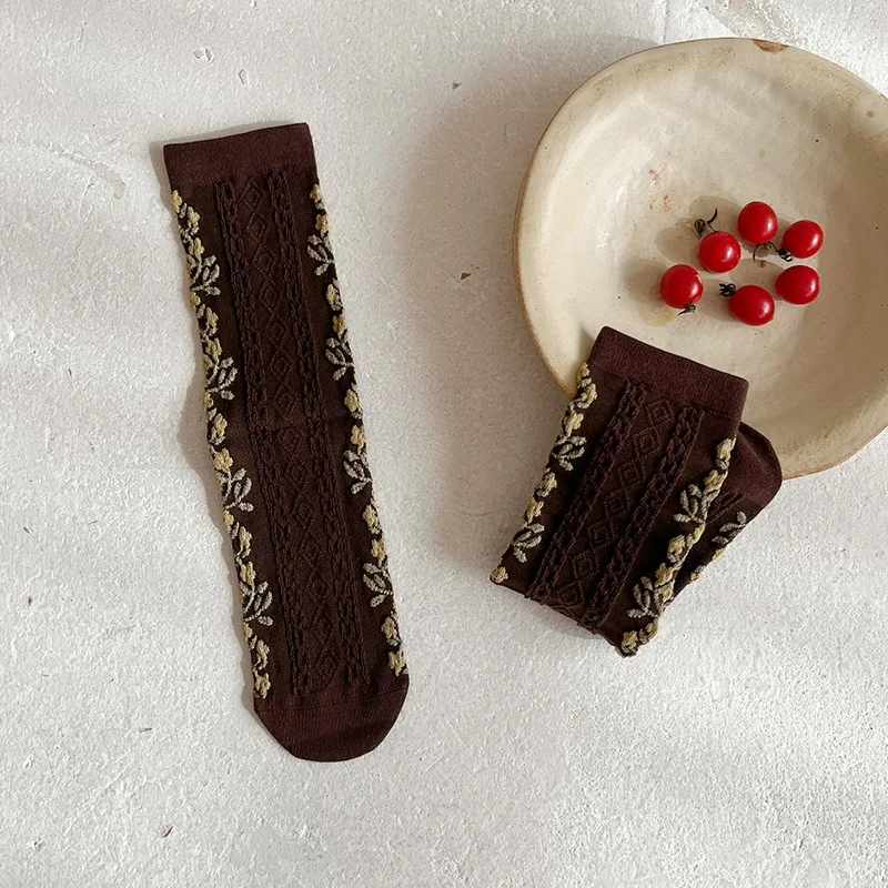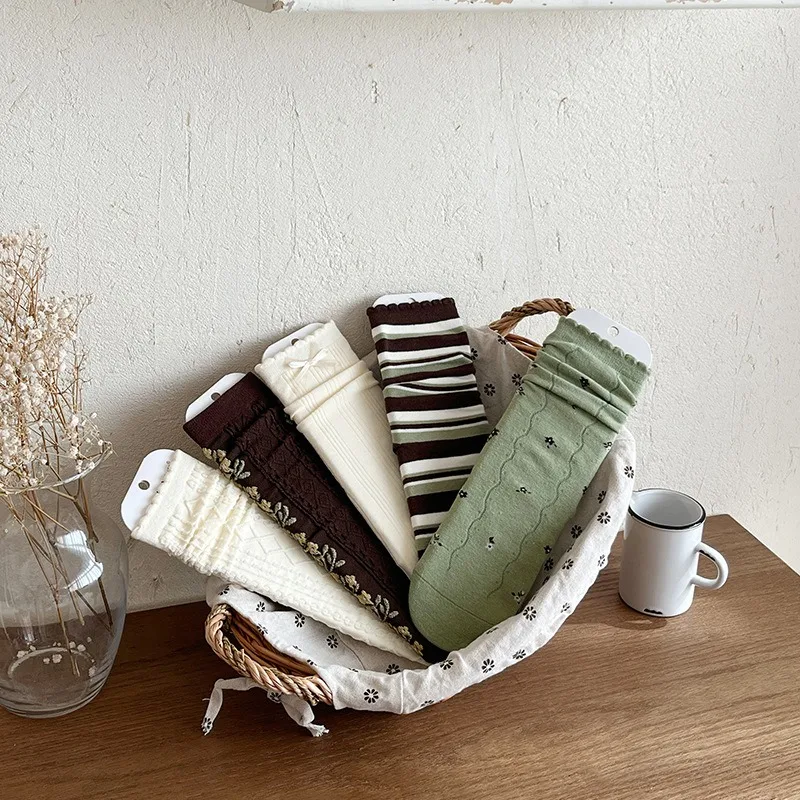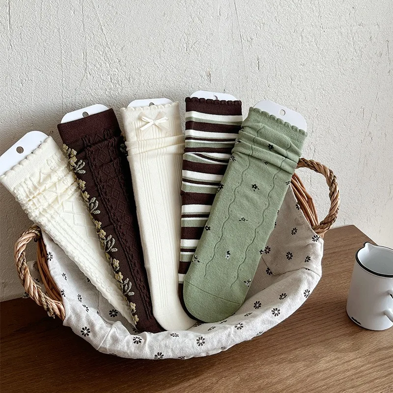 1 3 5 Pairs Womens Seamless Slouch Socks Retro Japanese Style Cotton Crew Socks Brown Little Flower Stripe