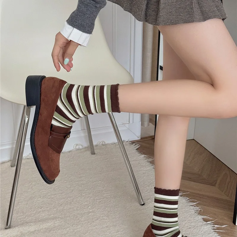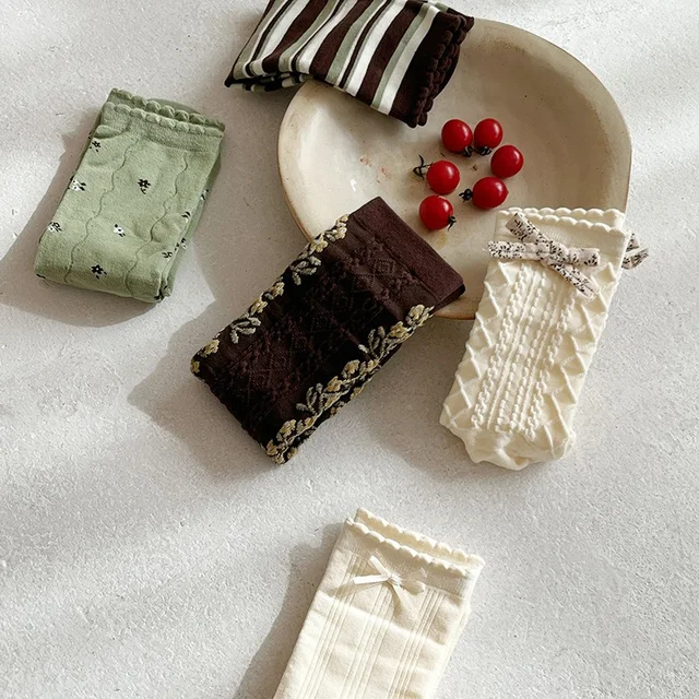 1 3 5 Pairs Womens Seamless Slouch Socks Retro Japanese Style Cotton Crew Socks Brown Little Flower Stripe