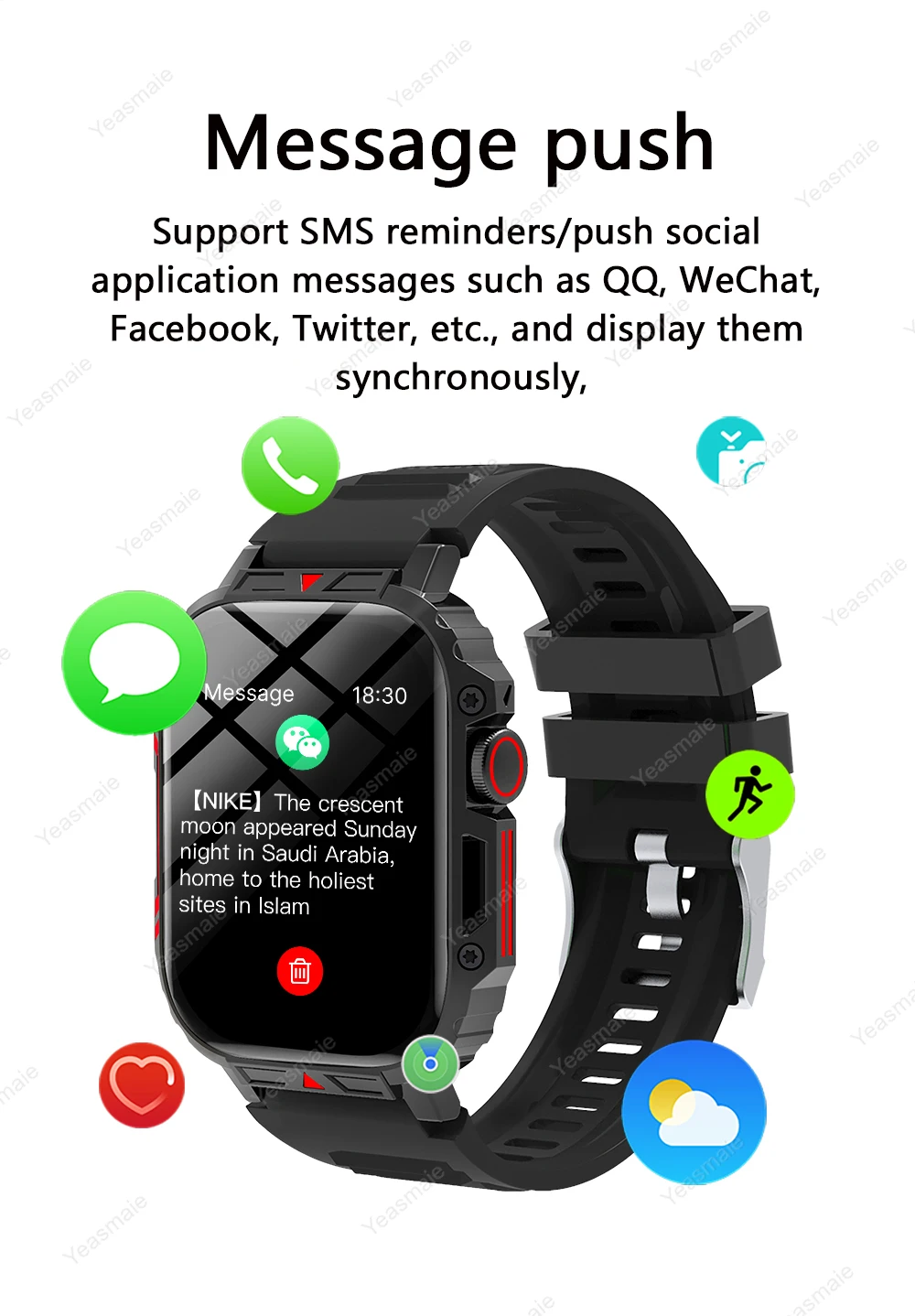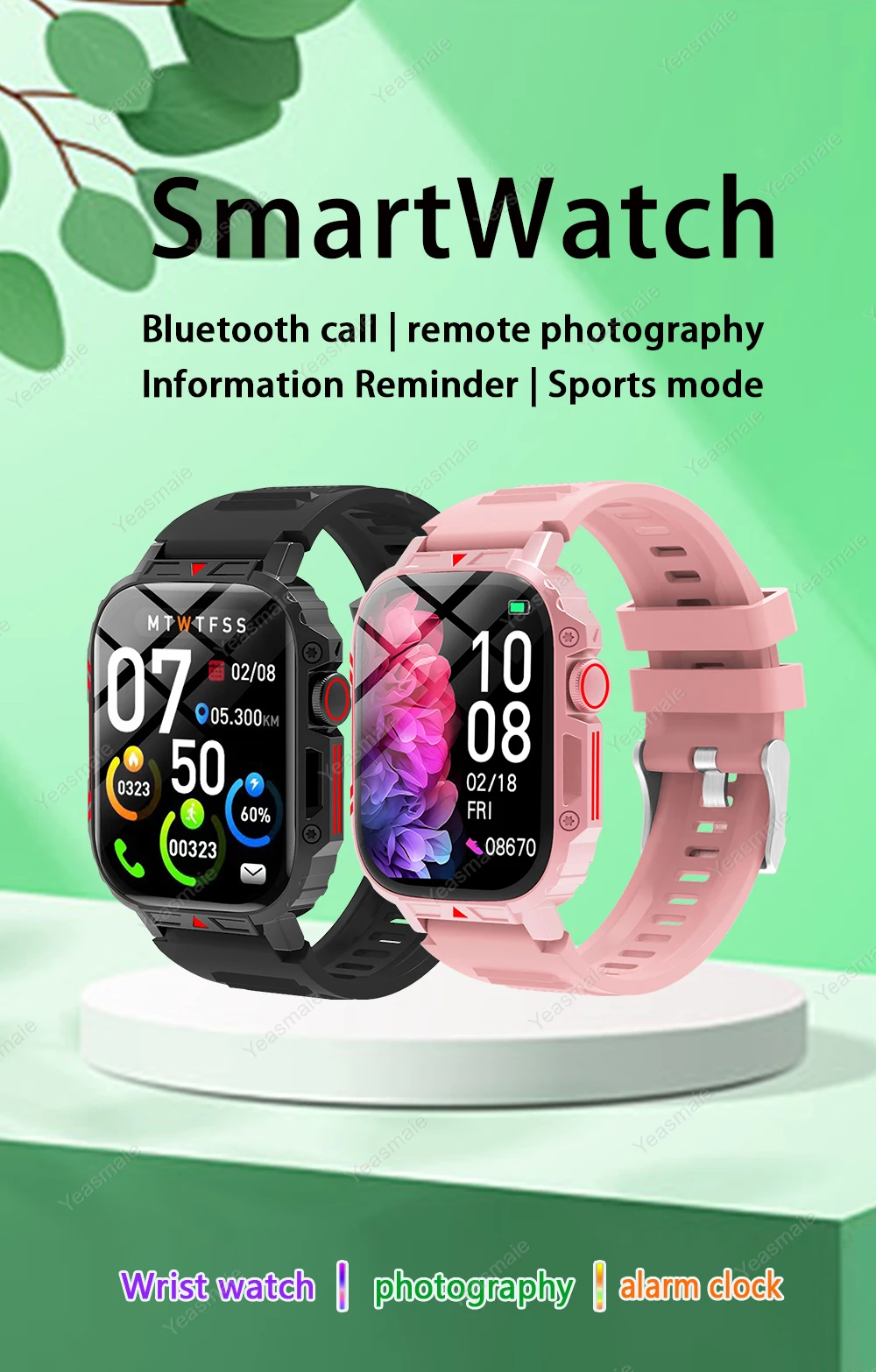 Heart rate/blood pressure/blood oxygen、Count steps/distance/calories、weather push、sleep monitoring、Information reminder、Alarm clock、Shake and take pictures、Dial library、ola esporte、local watch face、Turn your wrist to light up the screen、Sitting/drinking water、Continuous monitoring、Find mobile phone、make and receive calls、female function