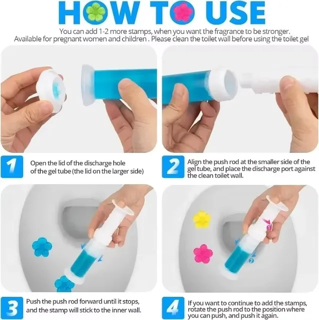 Usage: Gently squeeze the gel in the tube to the edge of the urinal or toilet with a push tube, and flush it with water to release fragrance. One can produce 12 flowers