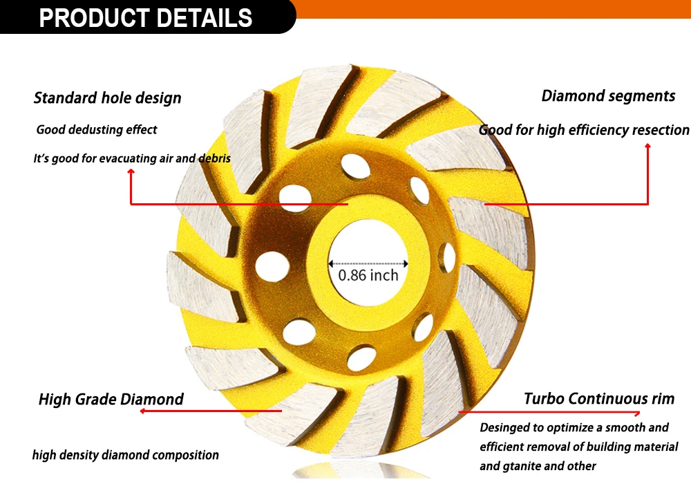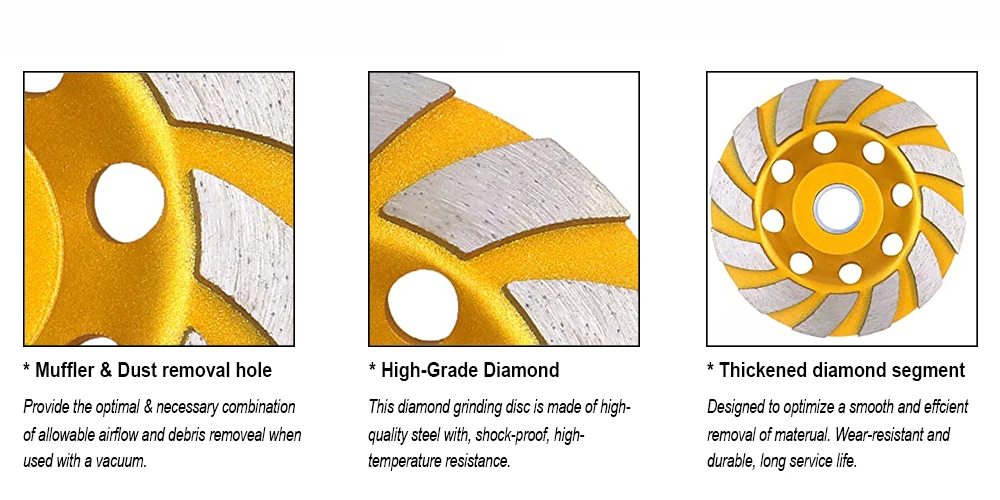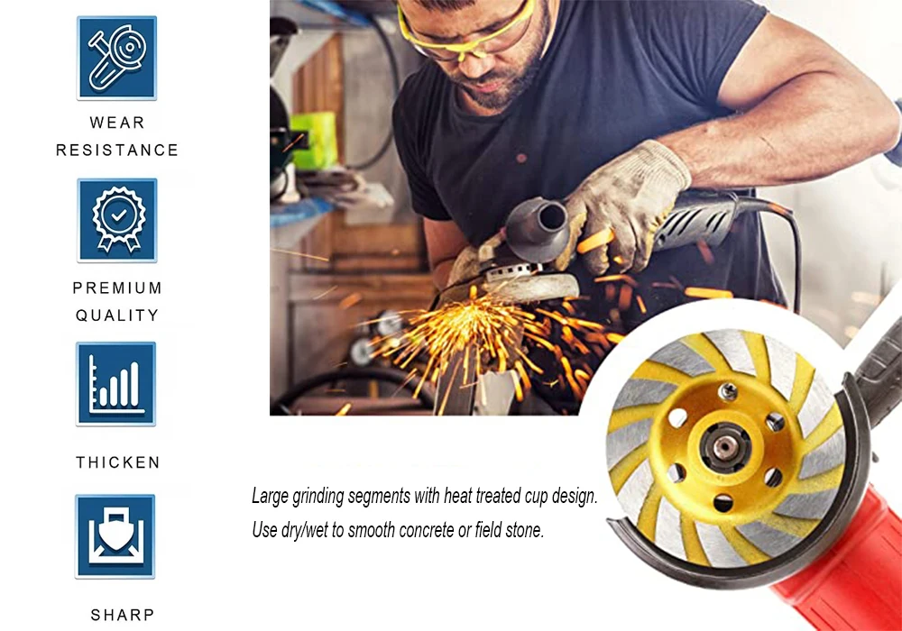 ★ GOOD DESIGN: Diamond disc has high diamond concentration for long life and aggressive material removal. Large grinding segments with heat-treated steel bodies which provide increases durability and wheel life.