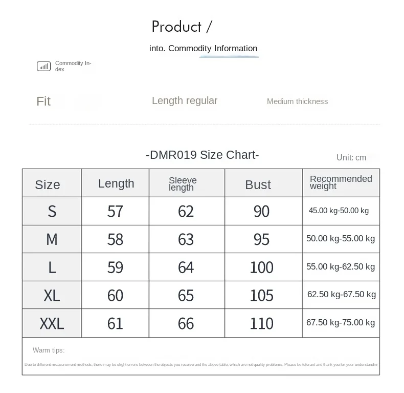 XL: Chest circumference of 105 centimeters, length of 60 centimeters, sleeve length of 65 centimeters