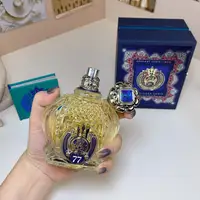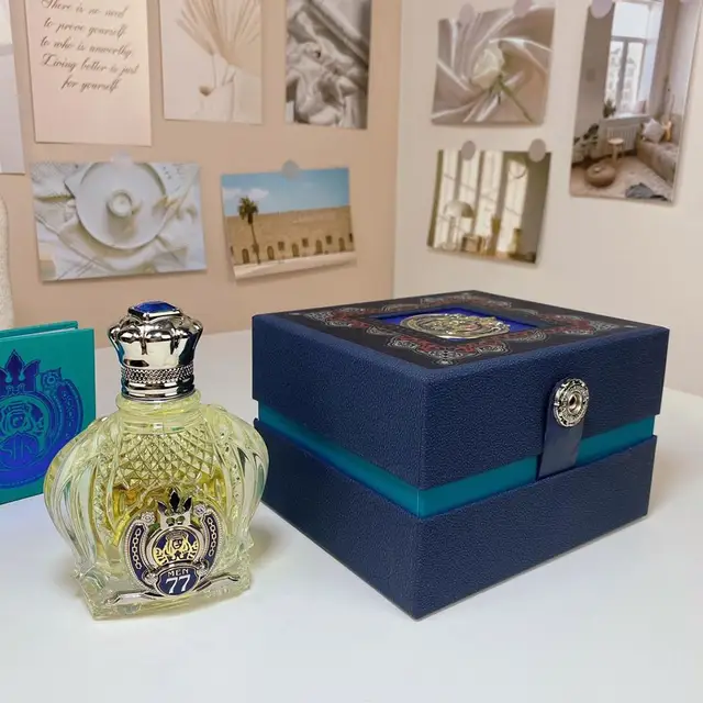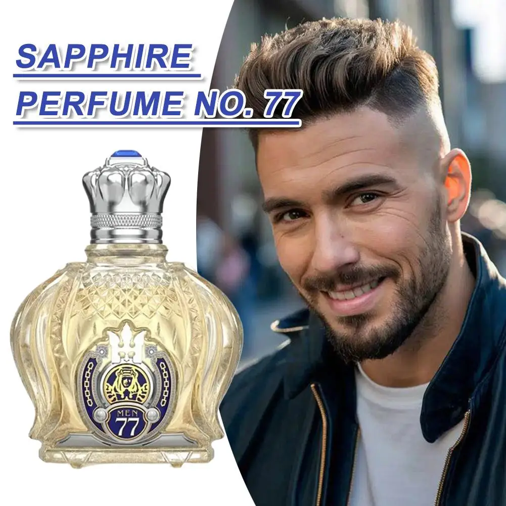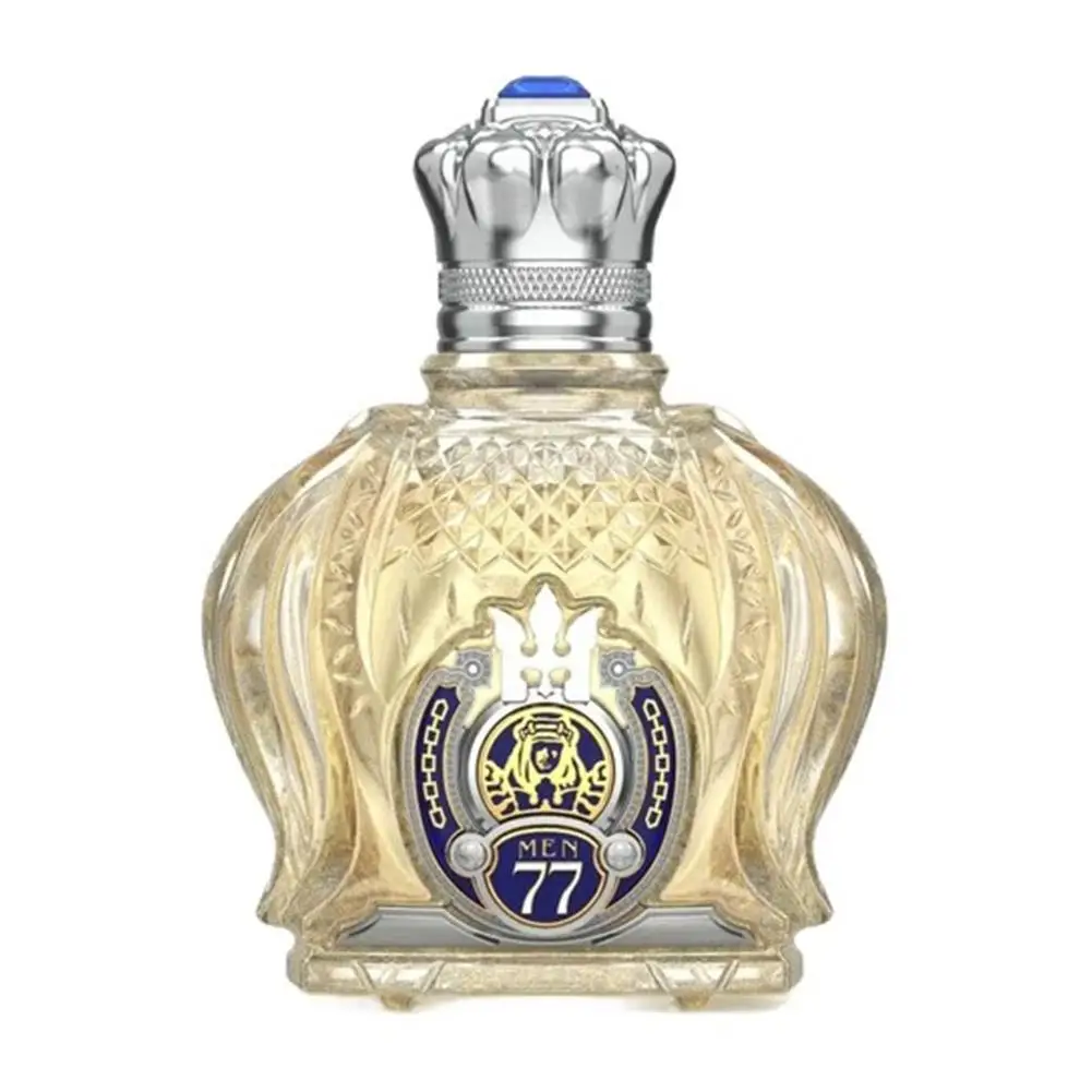 2. Regal Bottle Aesthetics: Each bottle is a testament to grandeur, crowned with an elaborately sculpted cap featuring a prominent blue accent. The meticulously etched glass body and the distinctive ‘MEN 77’ emblem on the front underscore a design that seamlessly blends artistry with powerful masculinity.