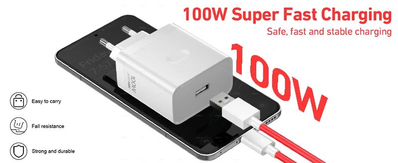 【Extended charging cable】This OnePlus charger comes with a 6.6ft USB A-C fast charging cable that supports SUPERVOOC and Warp Charge technologies, with a maximum current of up to 7.3A (Note: If you need 100W charging speed, you will need a 10A charging cable)