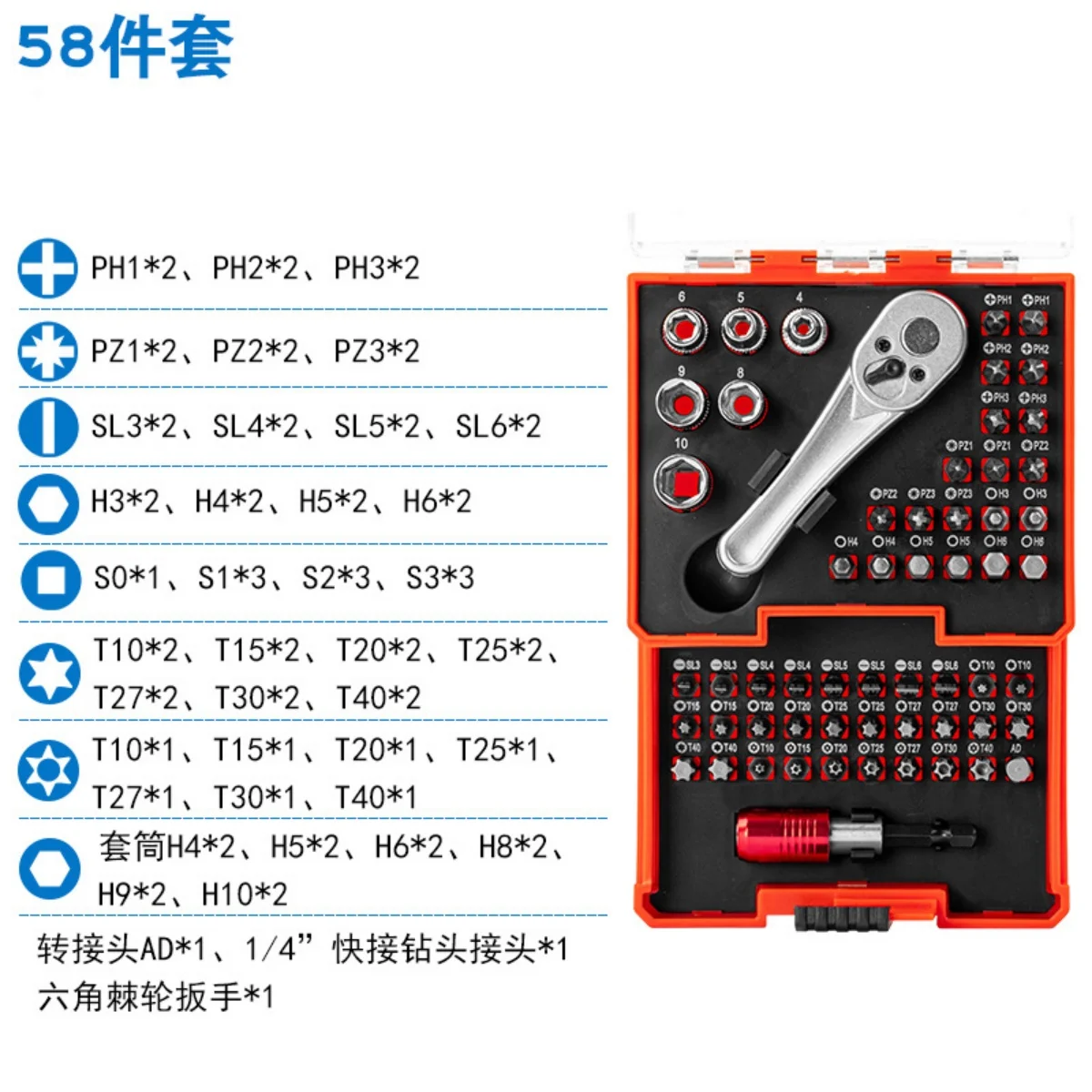 ▶The storage box is marked with size to make it easy to find and put back the correct bits and sockets. Keeps maintenance work neat and orderly and improves efficiency.