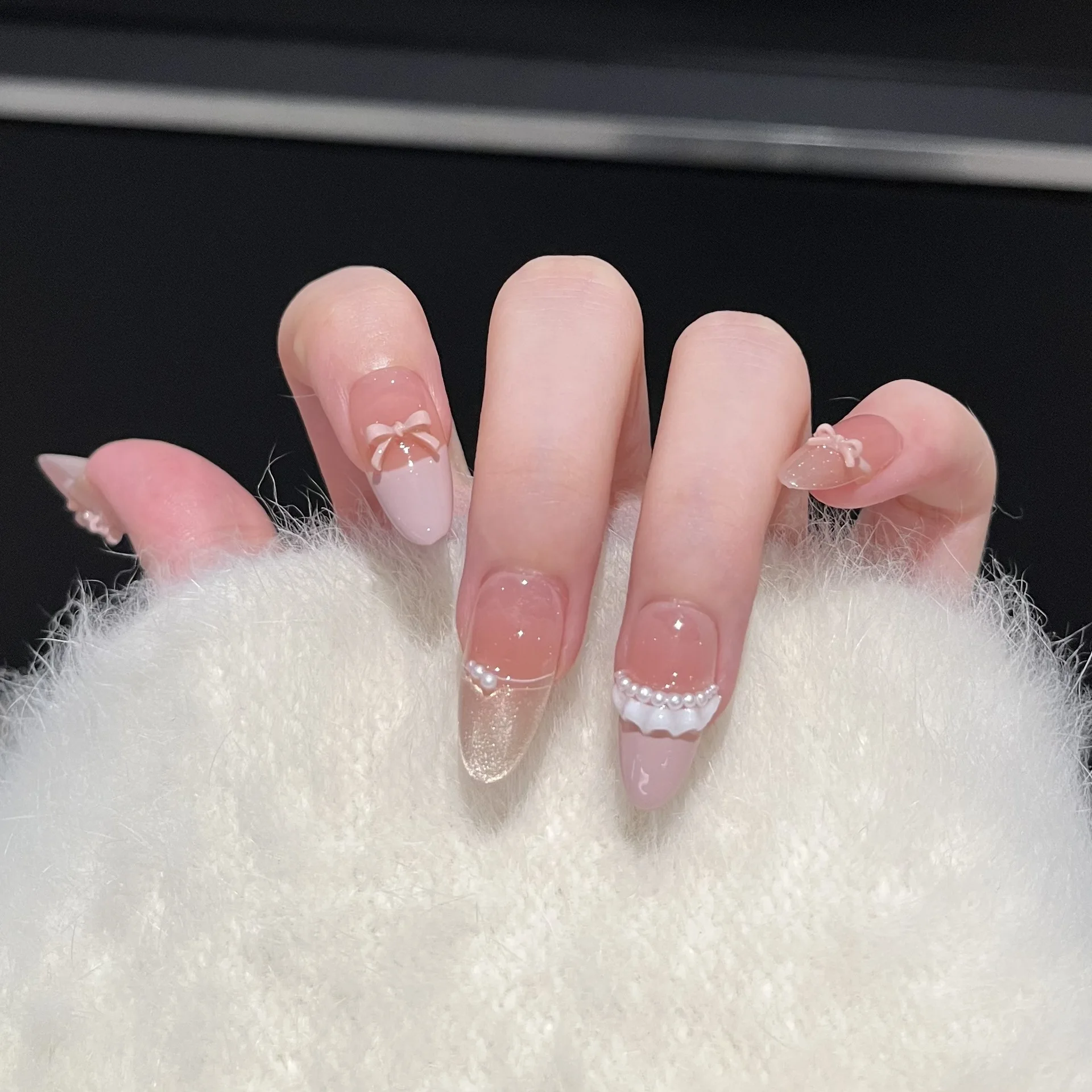 24pcs Sweet Cat Eye French Press on Nails Diamond-Pointed Three Dimensional Bow Knot Wearable Nail For Women&Girl Almond Nail