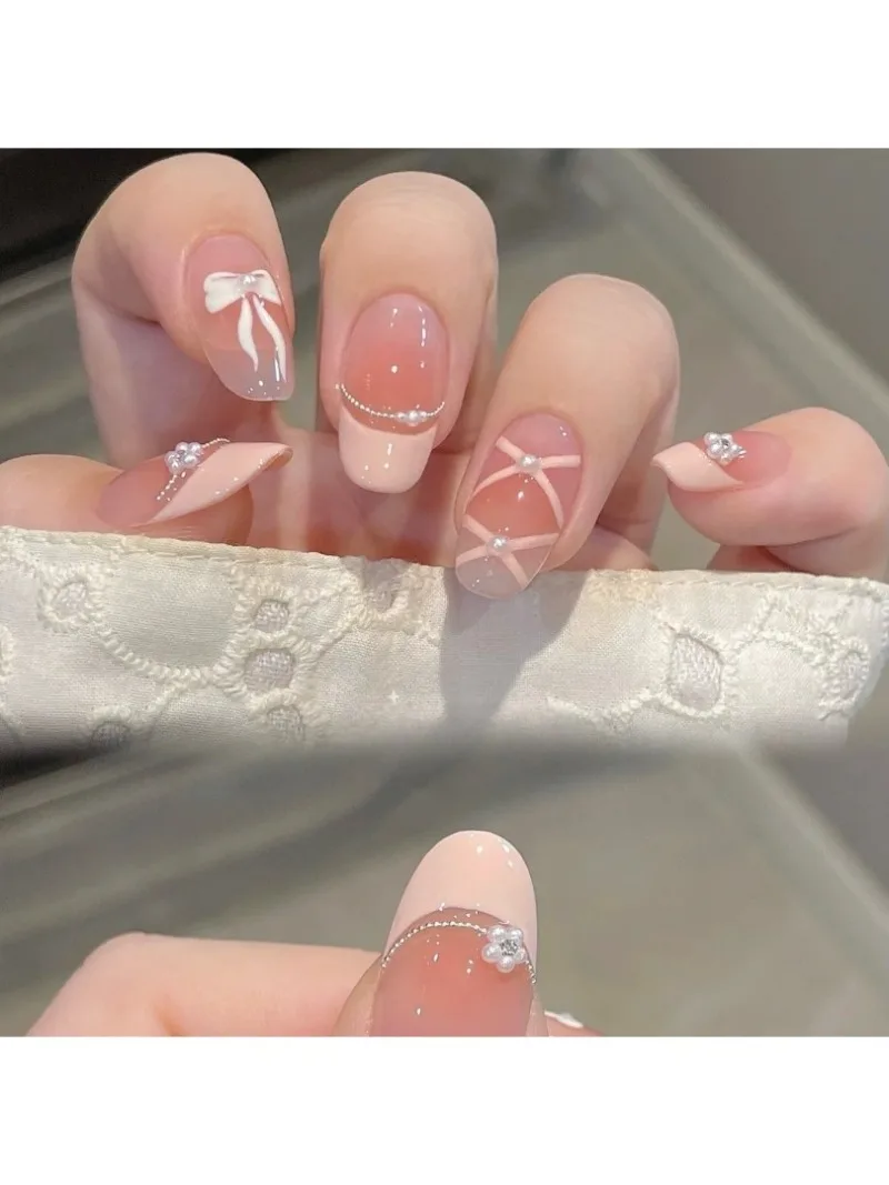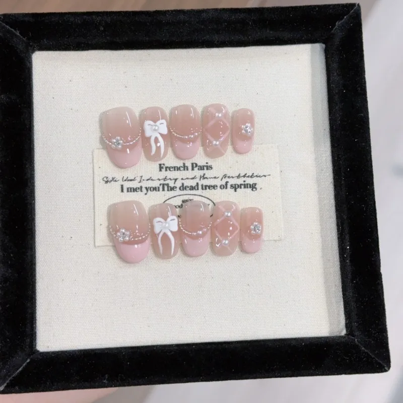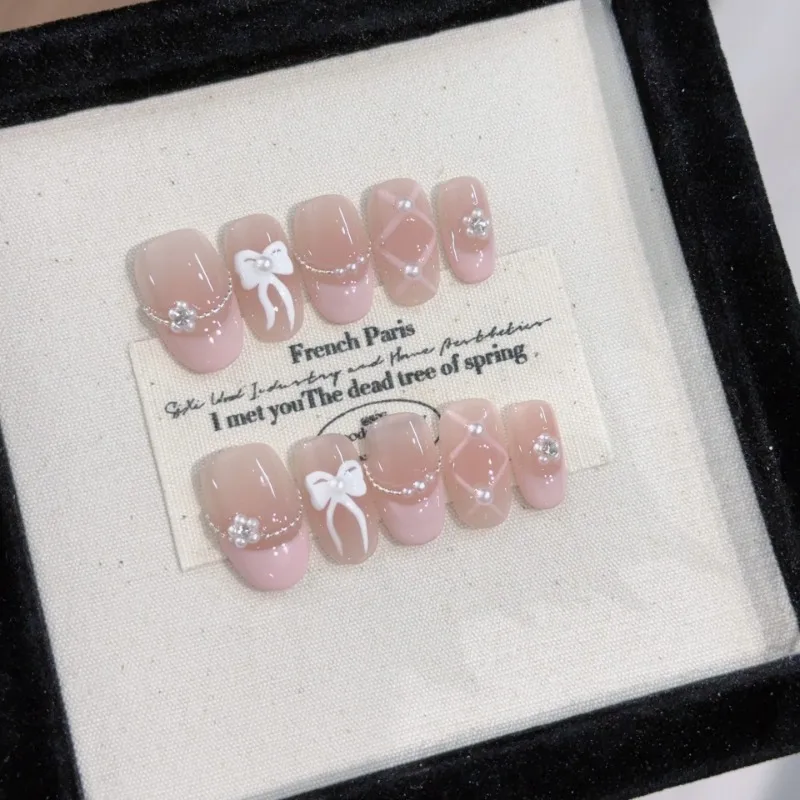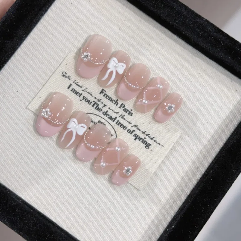 10Pcs Pink Gradient Handmade New Fake Nails Wearable Full Cover 3D Flowers Almond Nail Tips Set Detachable French Acrylic Nails