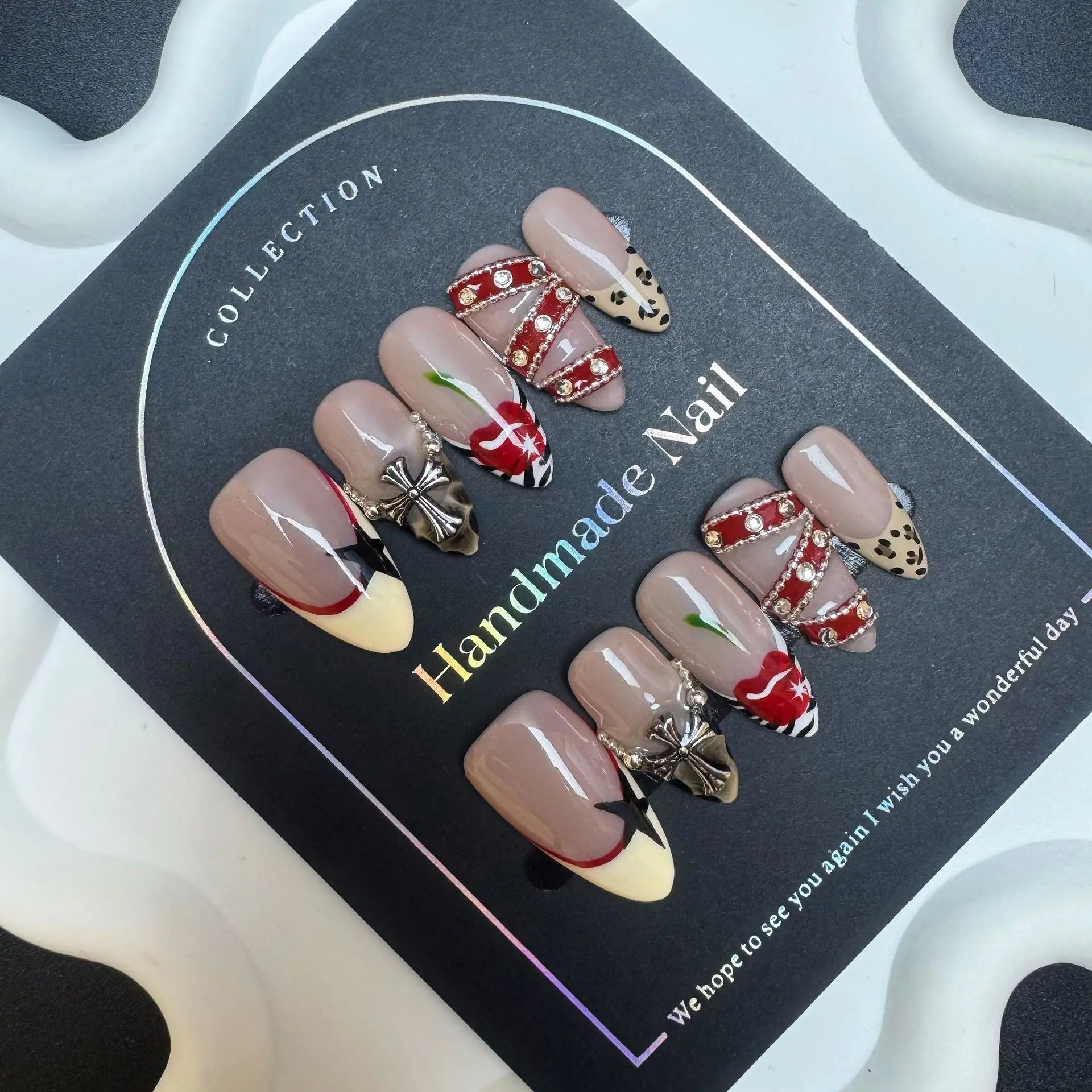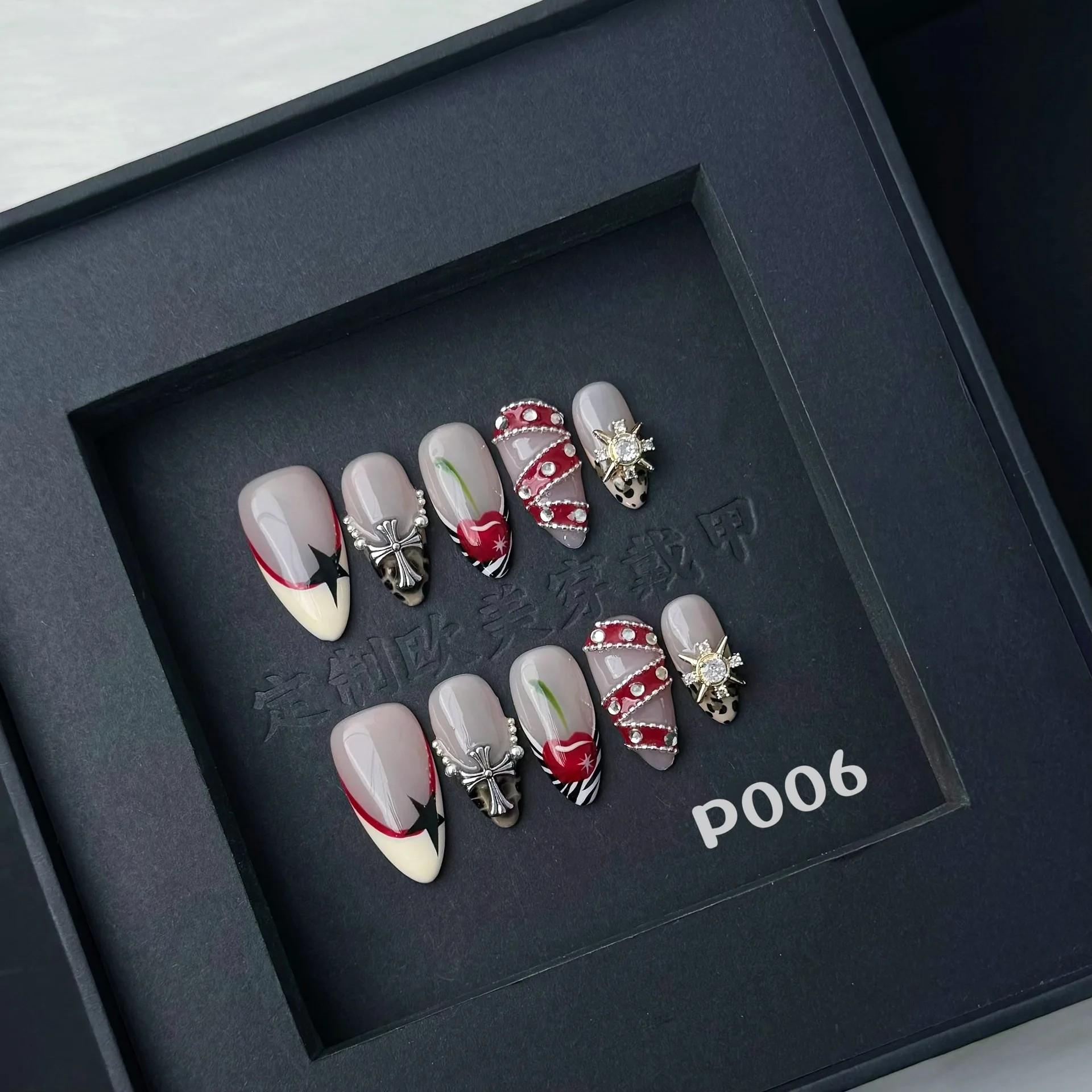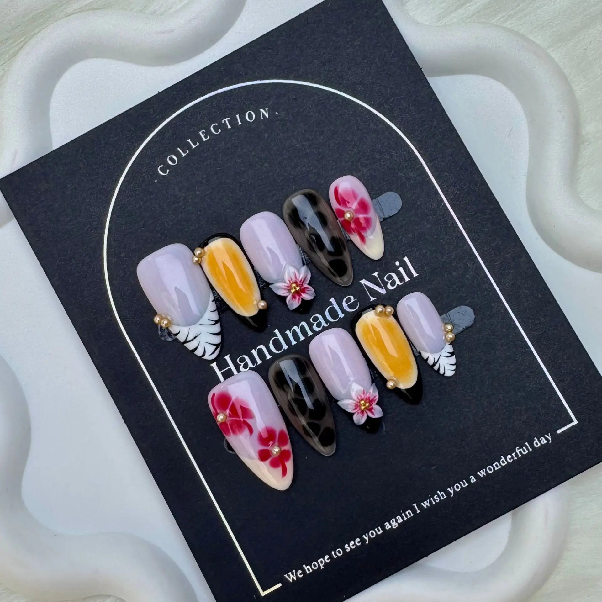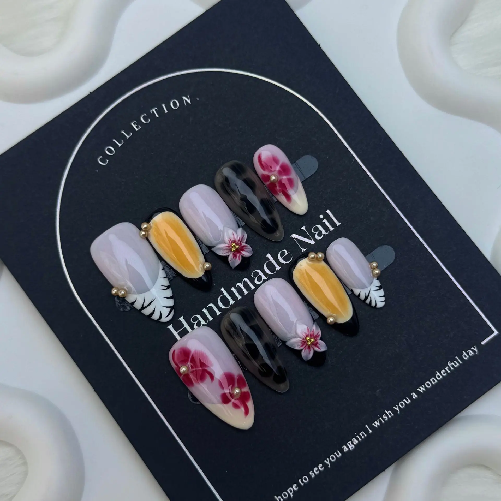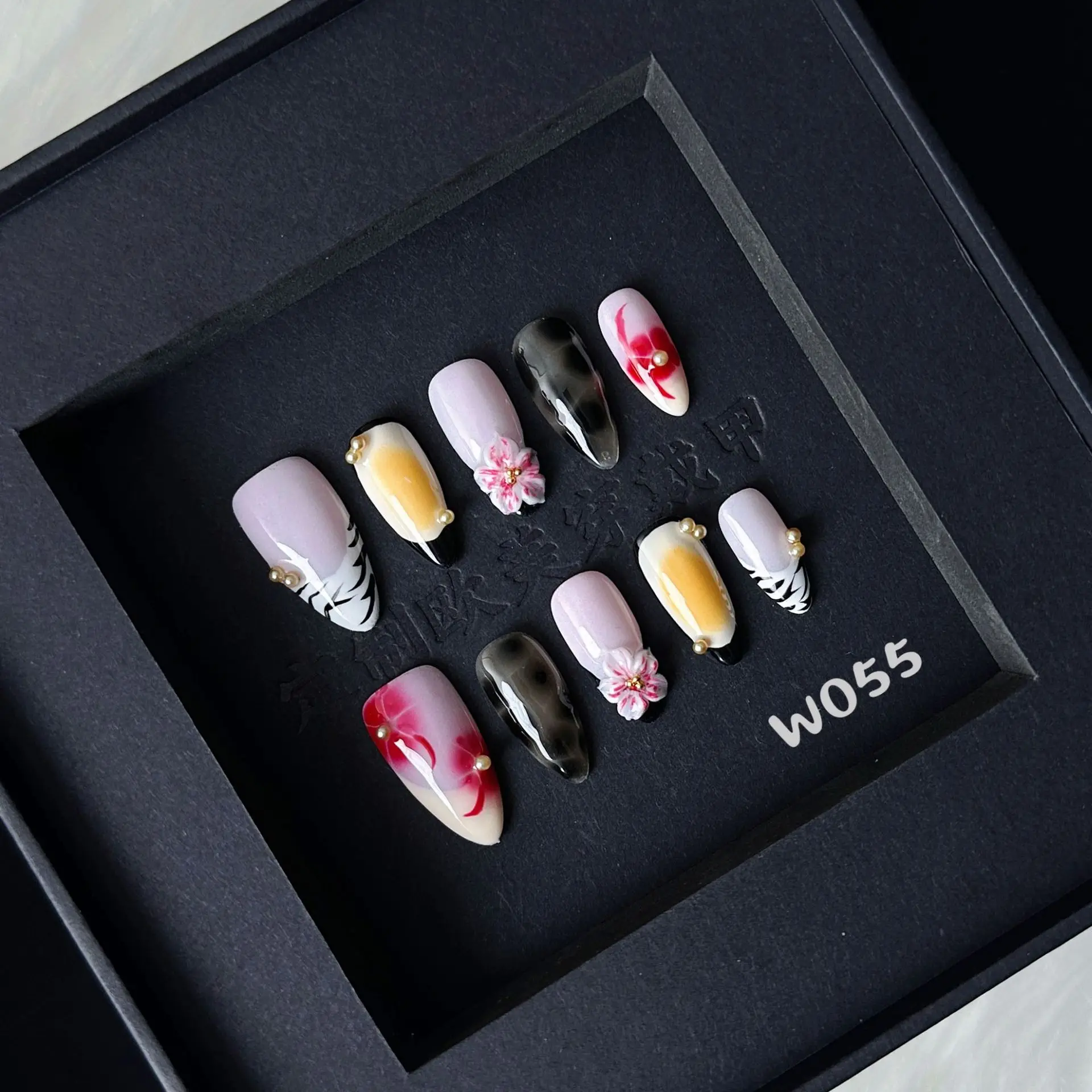 10pcs Glossy Almond French Press On Nails Handmade 3D Carving Flower Water Drop Designs False Nails Gradient Blue Pink Manicure
