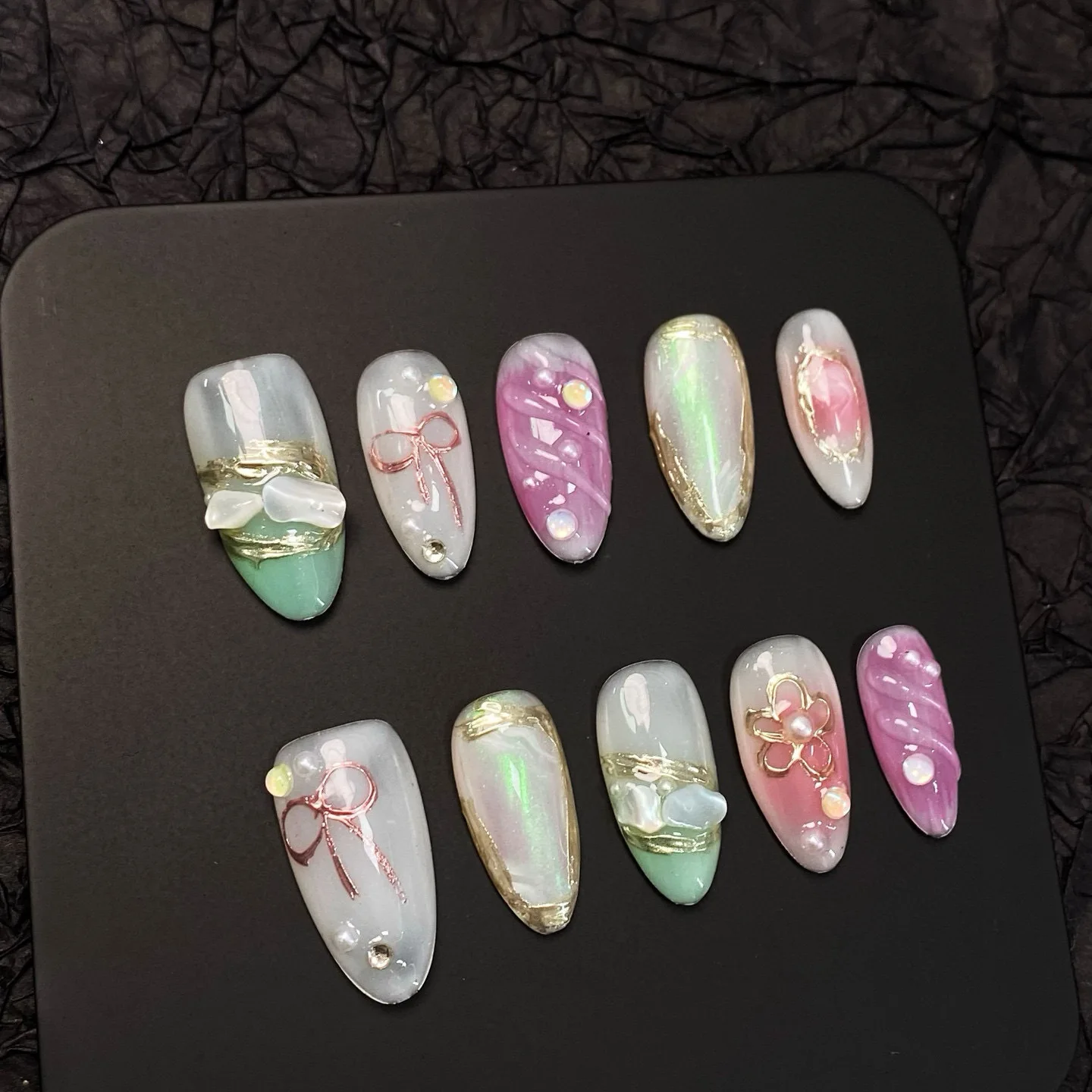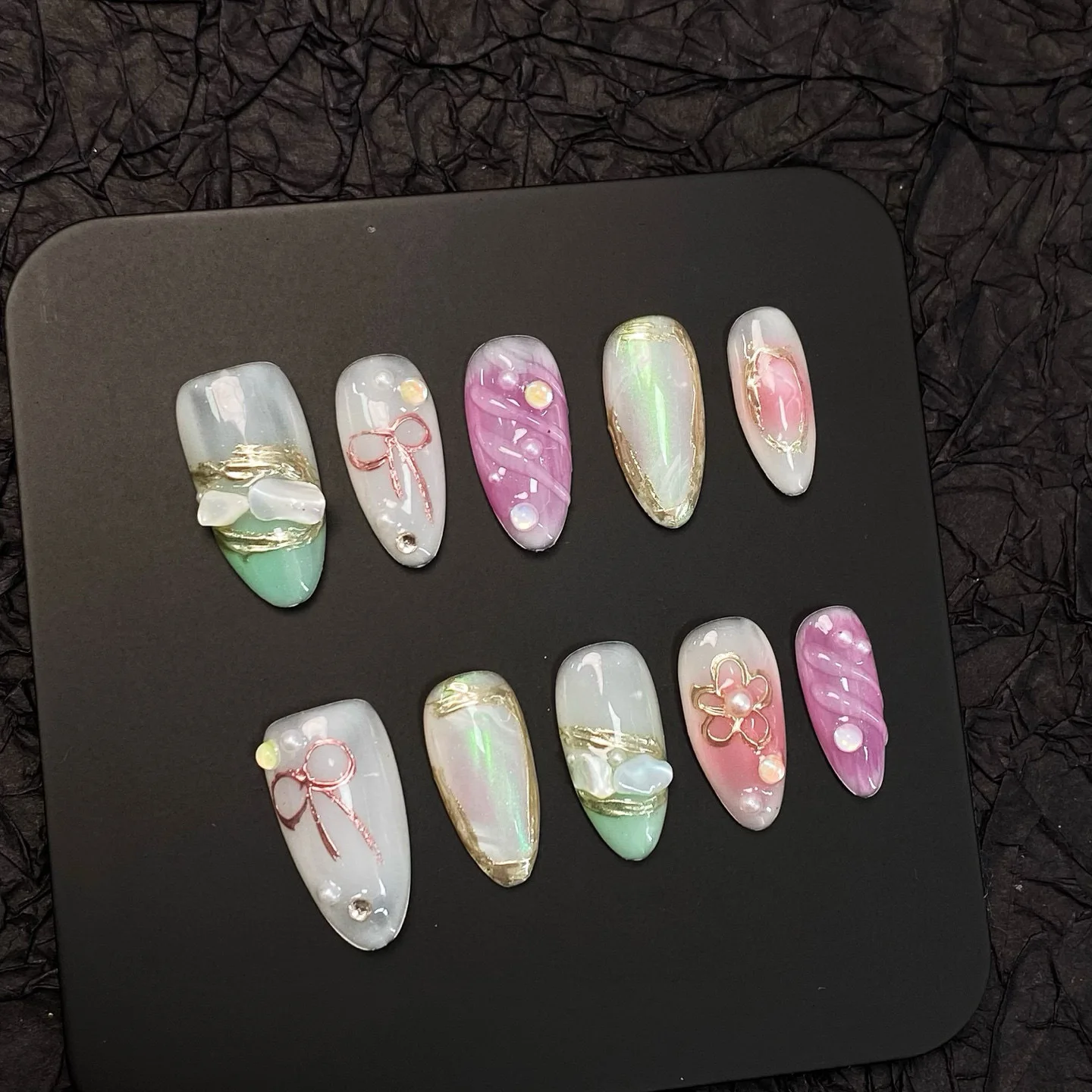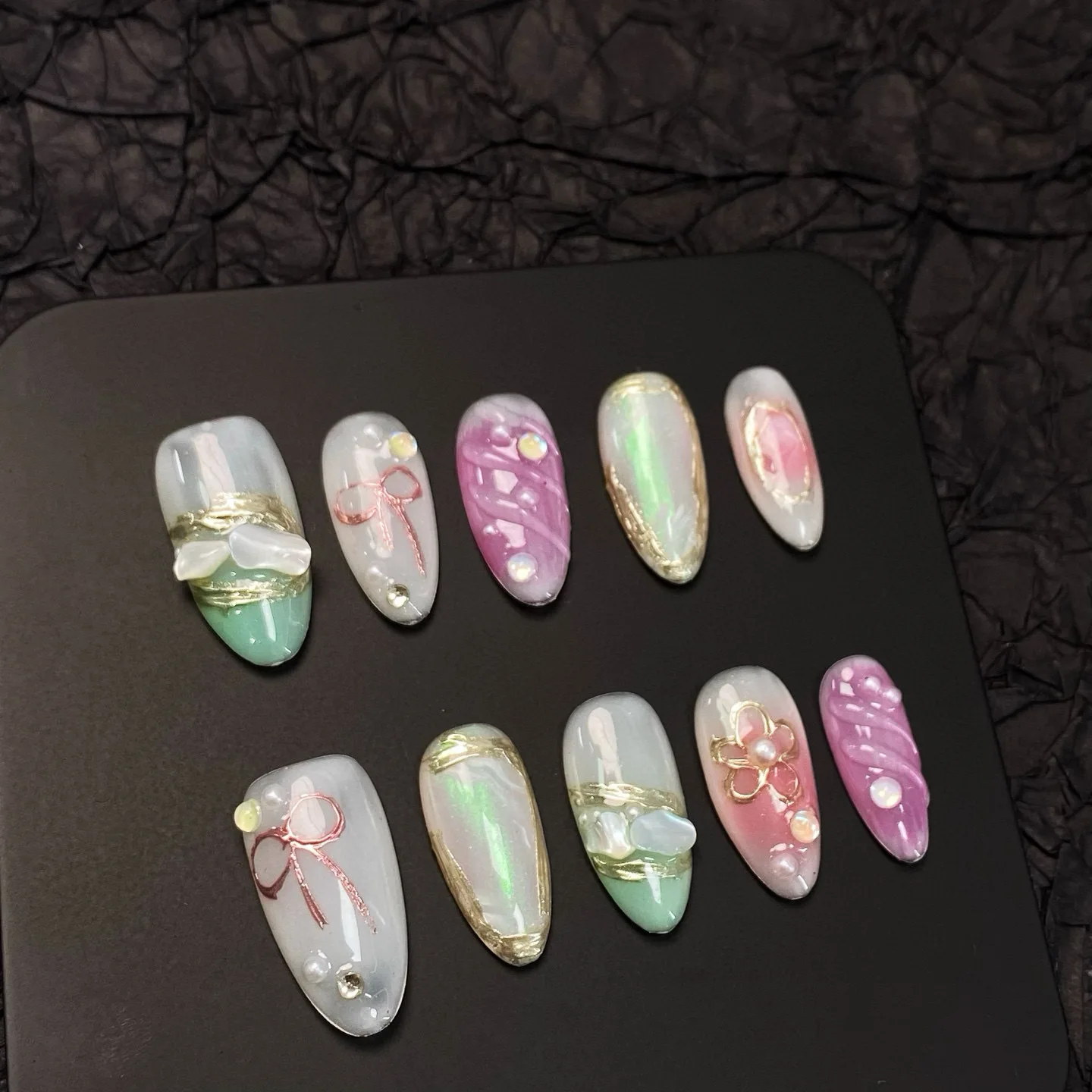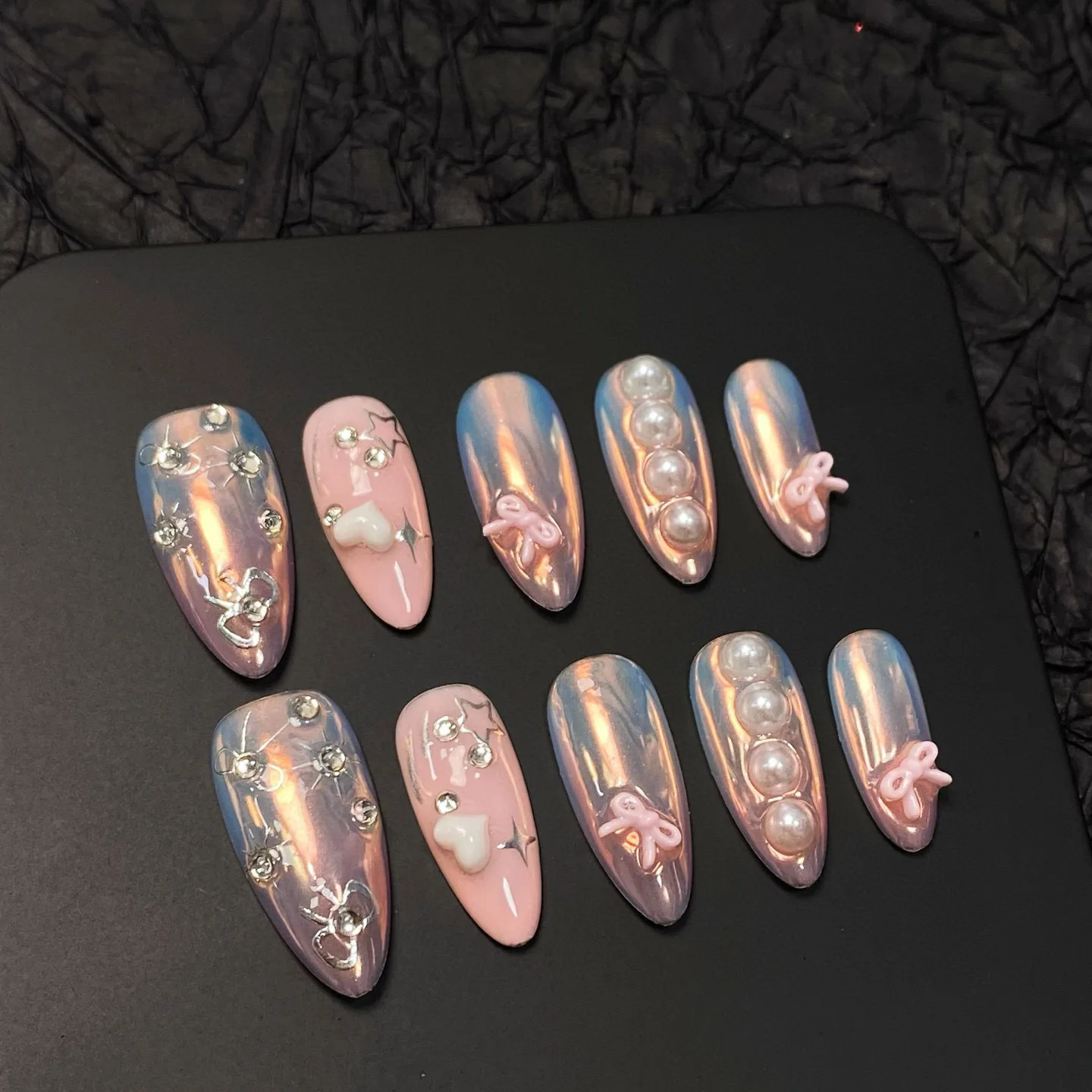 10pcs Handmade Pink Aurora Press on Nails Fish Tail Pearl Design Fake Nails Wearable Detachable French Almond False Nails