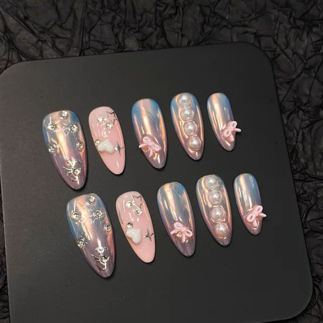 10pcs Handmade Pink Aurora Press on Nails Fish Tail Pearl Design Fake Nails Wearable Detachable French Almond False Nails