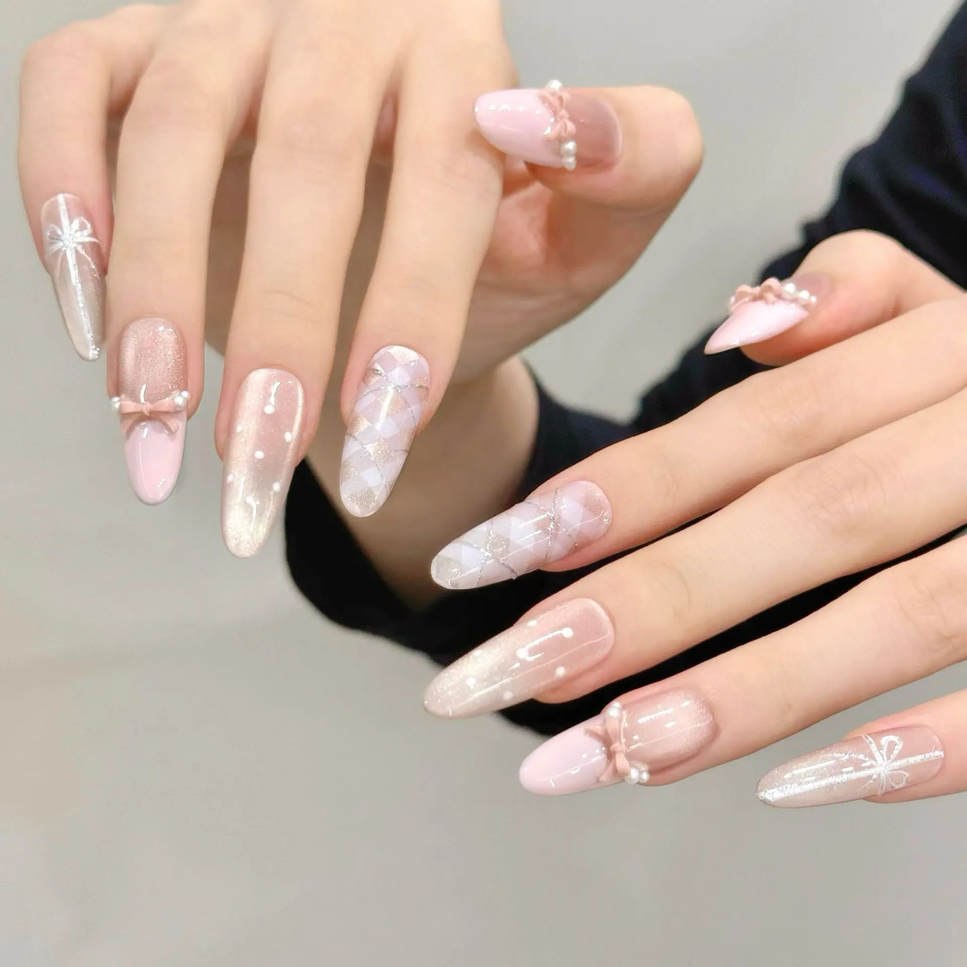 10pcs Handmade Press on Nails Black Bow Design Fake Nails Wearable Full Cover Shiny Nude Pink Cat Eye French Fake Nail Tips