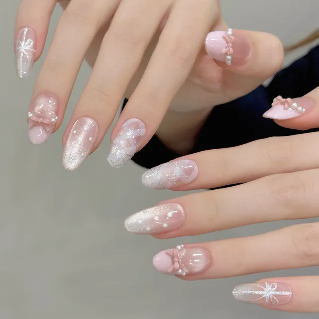 10pcs Handmade Press on Nails Black Bow Design Fake Nails Wearable Full Cover Shiny Nude Pink Cat Eye French Fake Nail Tips