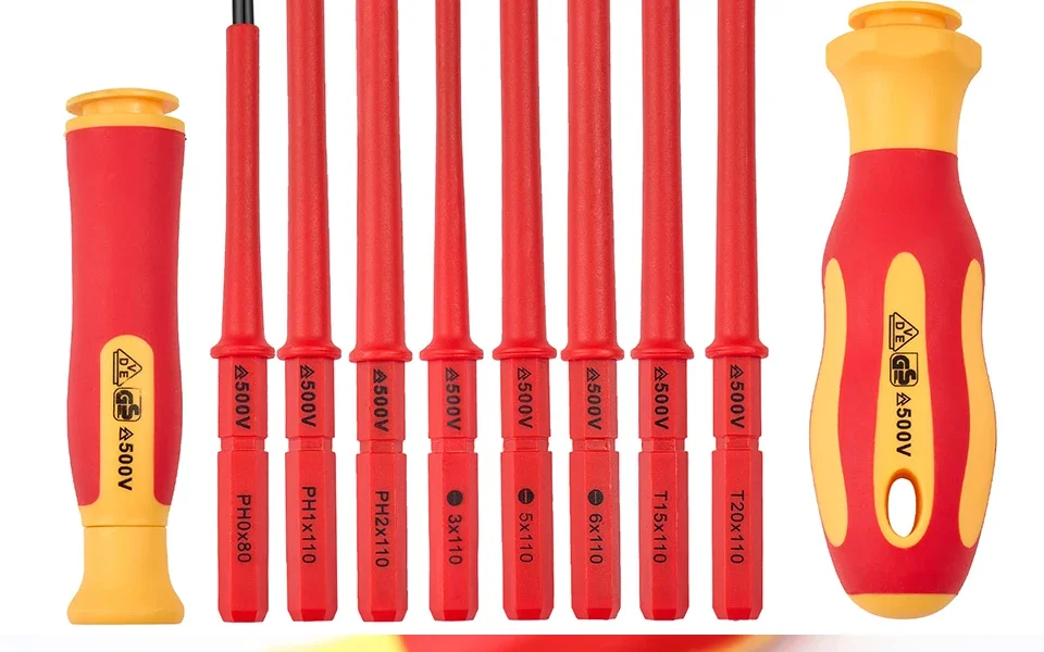 The screwdriver set includes:3 x Plain slot screwdrivers: 3 x 110mm, 5 x 110mm, 6 x 110mm2 x Cross slot screwdrivers: PH0 x 80mm, PH1 x 110mm, PH2 x 110mm2 x torx: T15 x 110mm, T20 x 110mm,1 x Insulated screwdriver handle,1 x Insulated precision screwdriver handle1 x Storage case