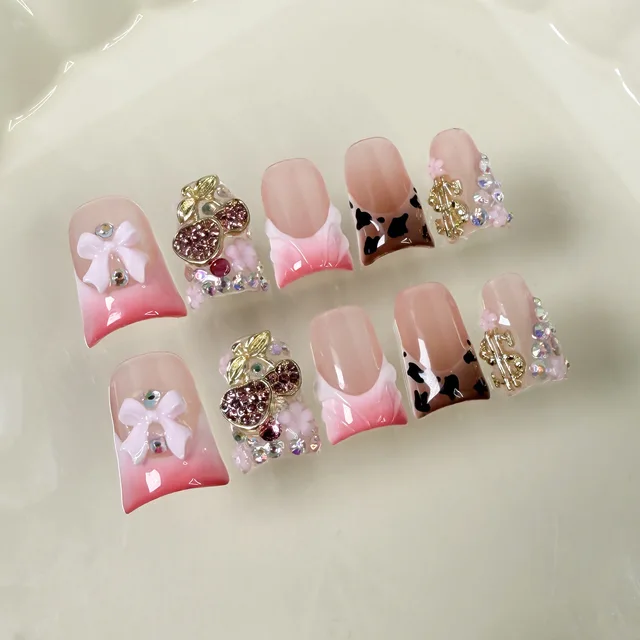 10pcs Sweet White Bowknots Press On Nails Pink French Style Glitter Diamond Pearl Decor Handmade False Nail Blush Duckbill Nails
