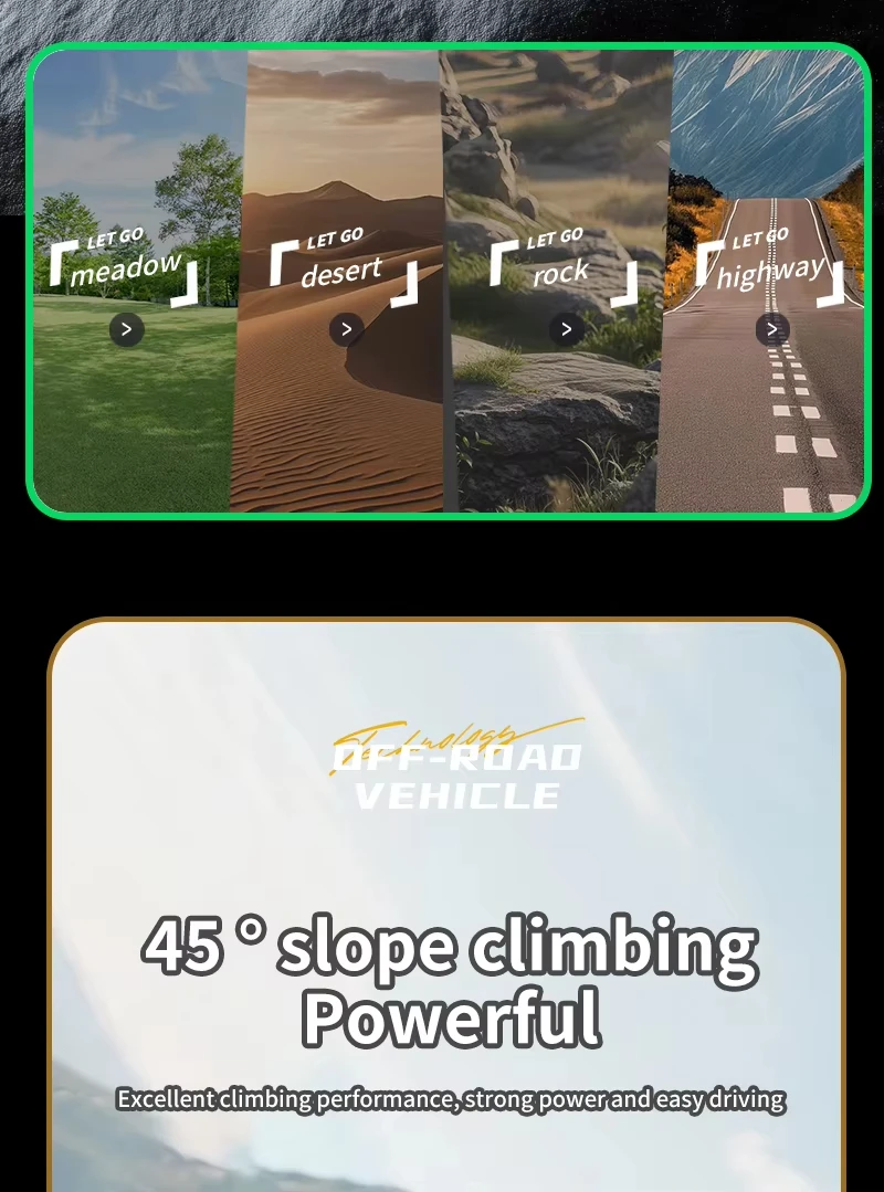 Powerful All-Terrain Performance: Equipped with a strong motor and 4 independent shock absorbers, it easily handles grass, sand, rocks, and pavement. It can even tackle inclines up to 45 degrees.
