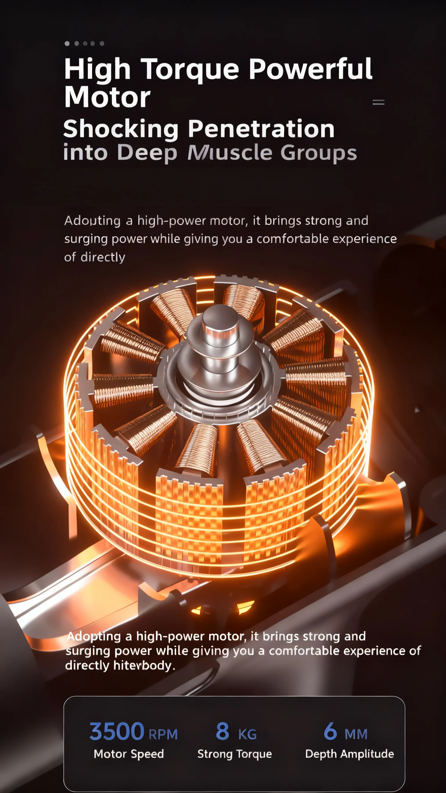 Driven by a high – torque motor with a speed of 3500 RPM, a strong torque of 8 KG, and a depth amplitude of 6 MM, it can powerfully penetrate deep muscle groups, effectively relieving tension.