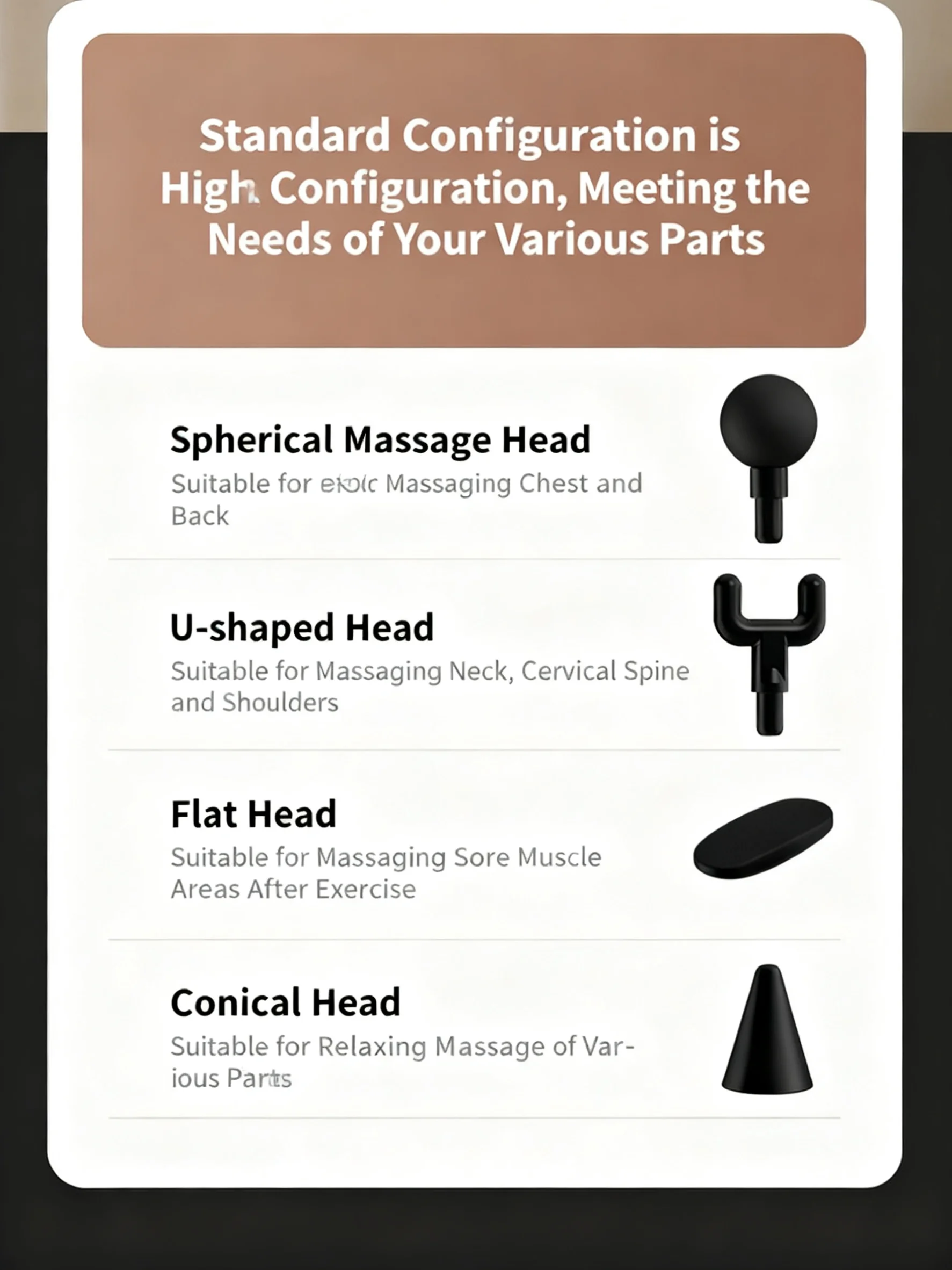 This fascia gun is a revolution in muscle care. It has a high – configuration standard setup, featuring four specialized massage heads. The spherical head is perfect for the chest and back, the U – shaped head targets the neck, cervical spine, and shoulders, the flat head soothes sore muscles after exercise, and the conical head provides relaxing massages for various body parts.
