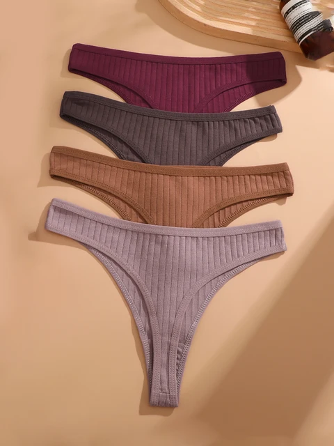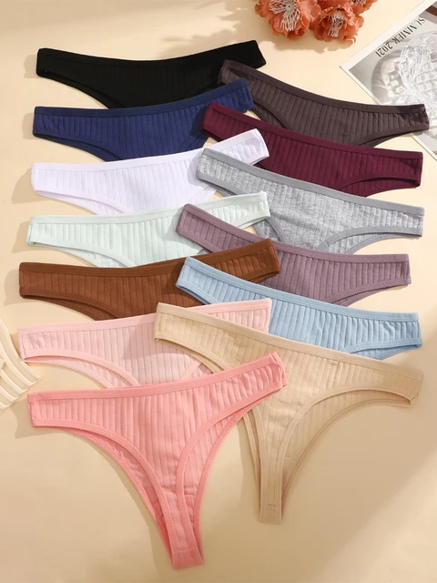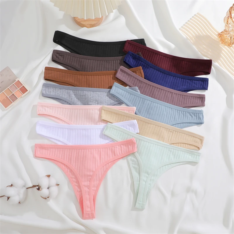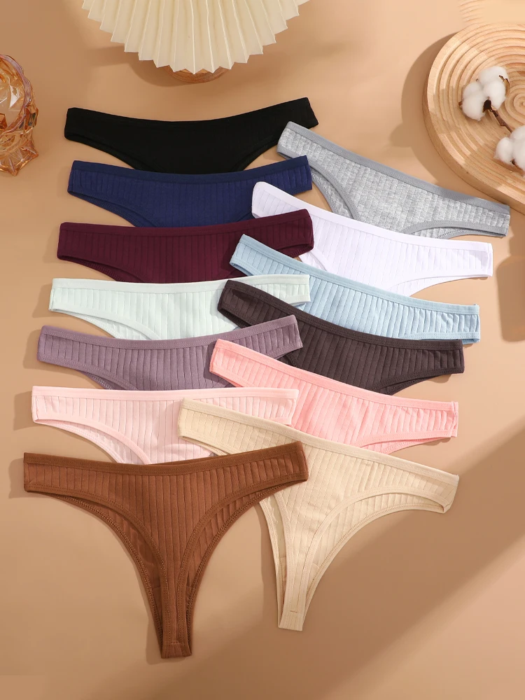 12pcs/Set Cotton Ribbed Striped Underwear for Women Sexy Breathable Solid Thongs Girls Low-Waist G-string Stretchy Soft Panties