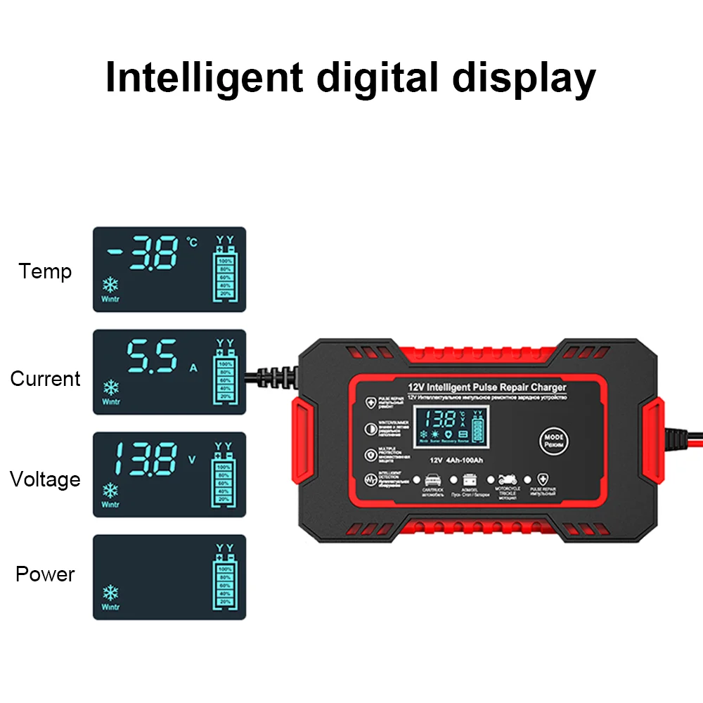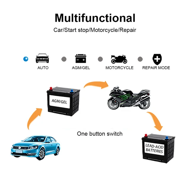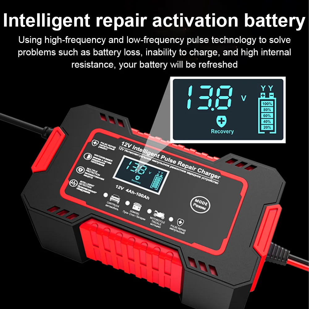 Battery maintainer: car battery charger, as well as battery maintenance device, pulse repair function can help repair the lost battery and extend battery life. Note: It cannot activate a failed battery or repair a severely damaged battery; it also cannot repair a battery to a 100% new battery.