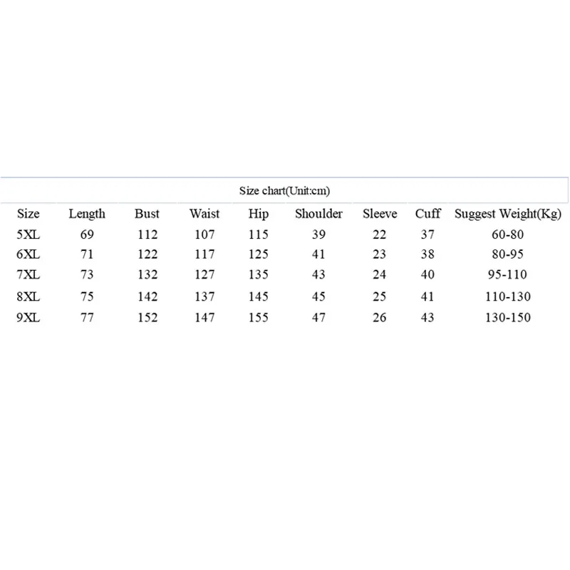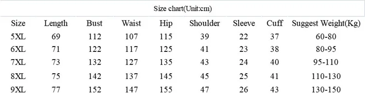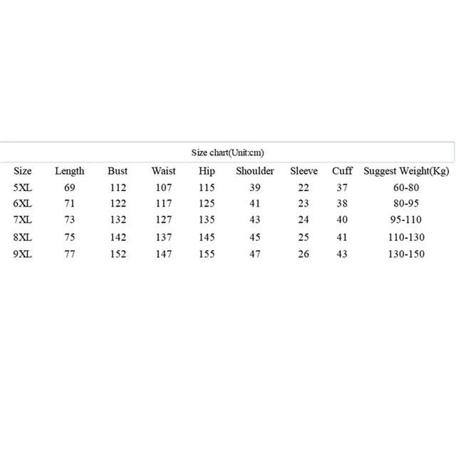 | size_info | {"sizeInfoList":[{"length":{"cm":"112","inch":"44.09"},"size":"5XL","vid":-1},{"length":{"cm":"122","inch":"48.03"},"size":"6XL","vid":-2},{"length":{"cm":"132","inch":"51.97"},"size":"7XL","vid":-3},{"length":{"cm":"142","inch":"55.91"},"size":"8XL","vid":-4},{"length":{"cm":"152","inch":"59.84"},"size":"9XL","vid":-5}]} |