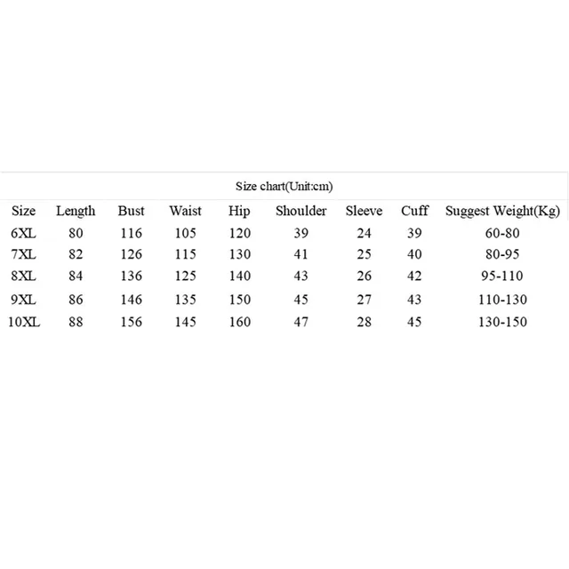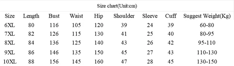 | size_info | {"sizeInfoList":[{"length":{"cm":"116","inch":"45.67"},"size":"6XL","vid":-1},{"length":{"cm":"126","inch":"49.61"},"size":"7XL","vid":-2},{"length":{"cm":"136","inch":"53.54"},"size":"8XL","vid":-3},{"length":{"cm":"146","inch":"57.48"},"size":"9XL","vid":-4},{"length":{"cm":"156","inch":"61.42"},"size":"10XL","vid":-5}]} |
