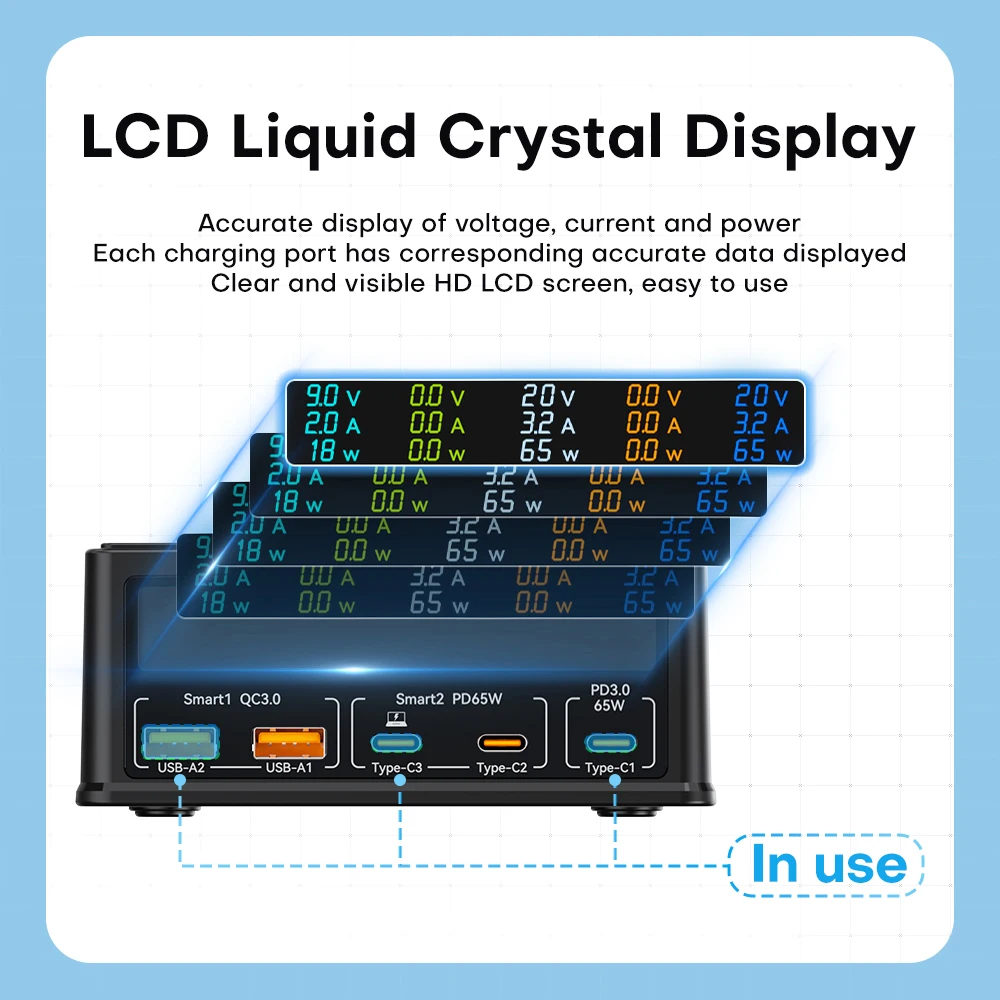 âš¡ The display can simultaneously show the output parameters of 5 USB portsï¼›