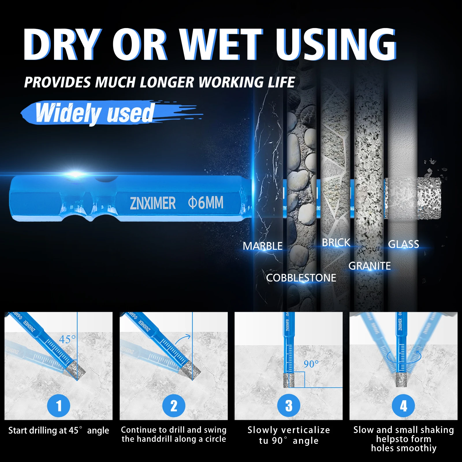 For drilling granite & marble, masonry, concrete, tile/ceramic, glass, hard plastic…..
