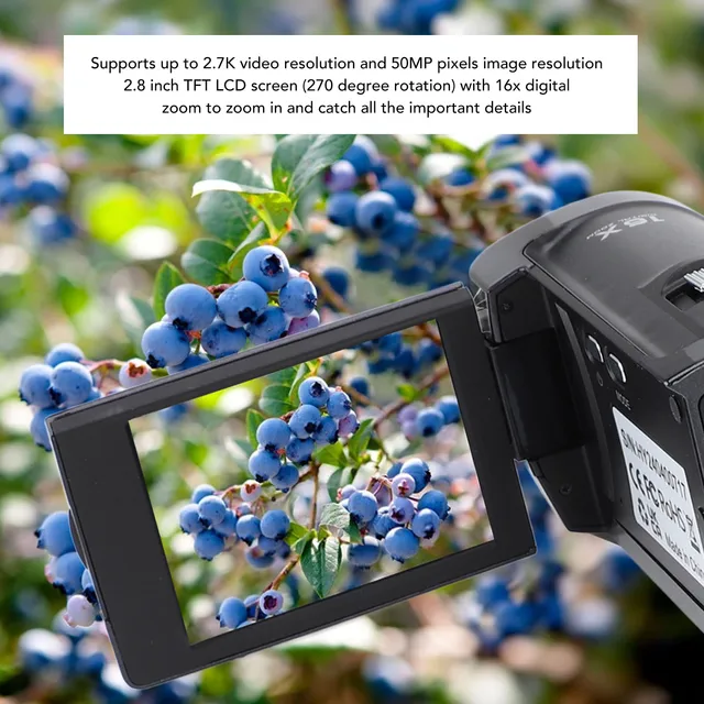 1. 2.7K CAMCORDER: This camcorder supports up to 2.7K video resolution and 50MP pixels image resolution. 2.8 inch TFT LCD screen (270 degree rotation) with 16x digital zoom magnifies the image to catch all the important details. There’s also a built in LED fill light to bring brightness and clarity to every frame.