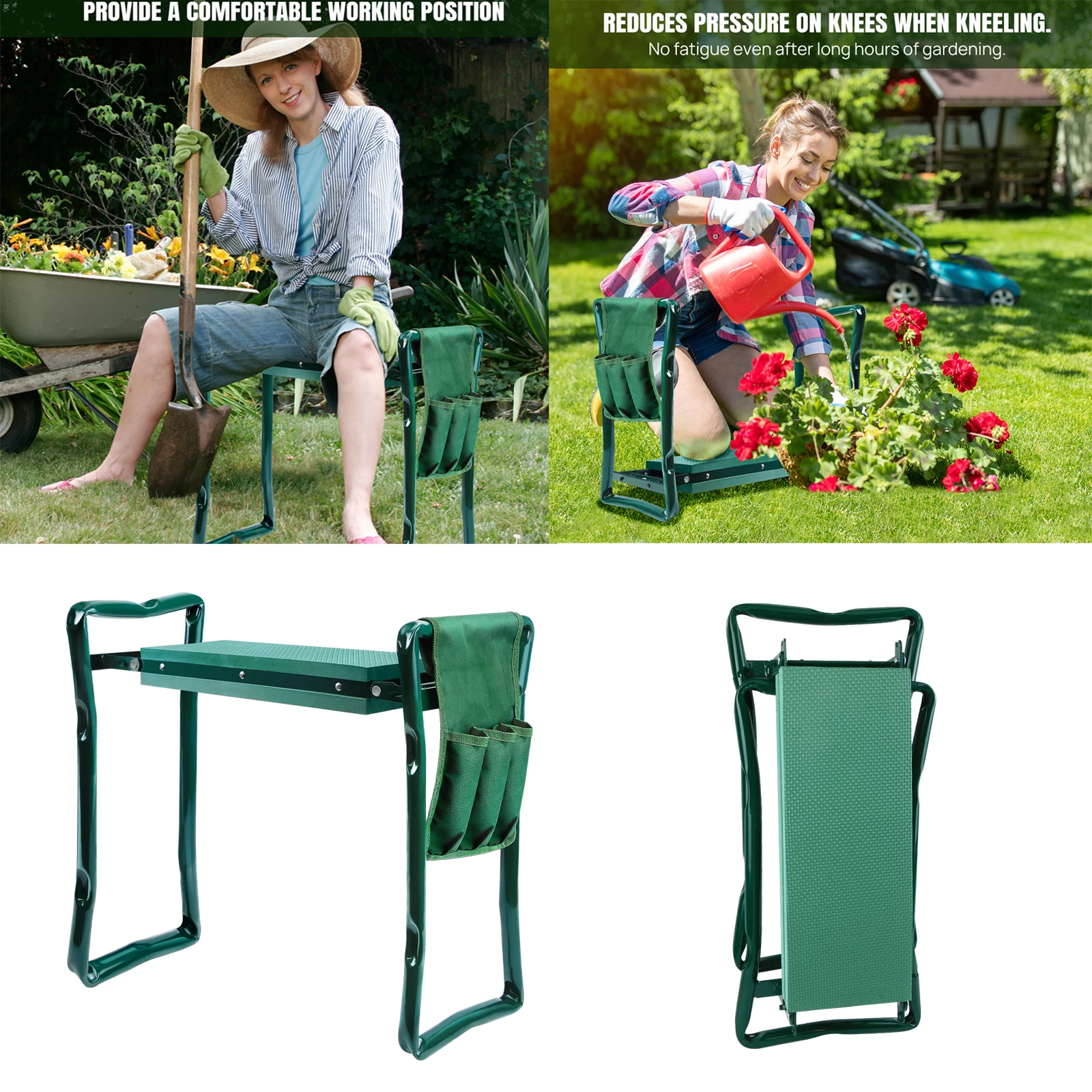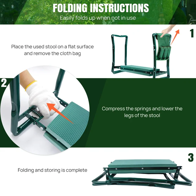 FOLDABLE & EASY TO STORE: The kneeling stool folding seat easily folds into a compact size for convenient storage. Simply pull the handlebars away from the foam pad and fold the legs under, allowing this gardening kneeling stool to lay flat with the cushion.