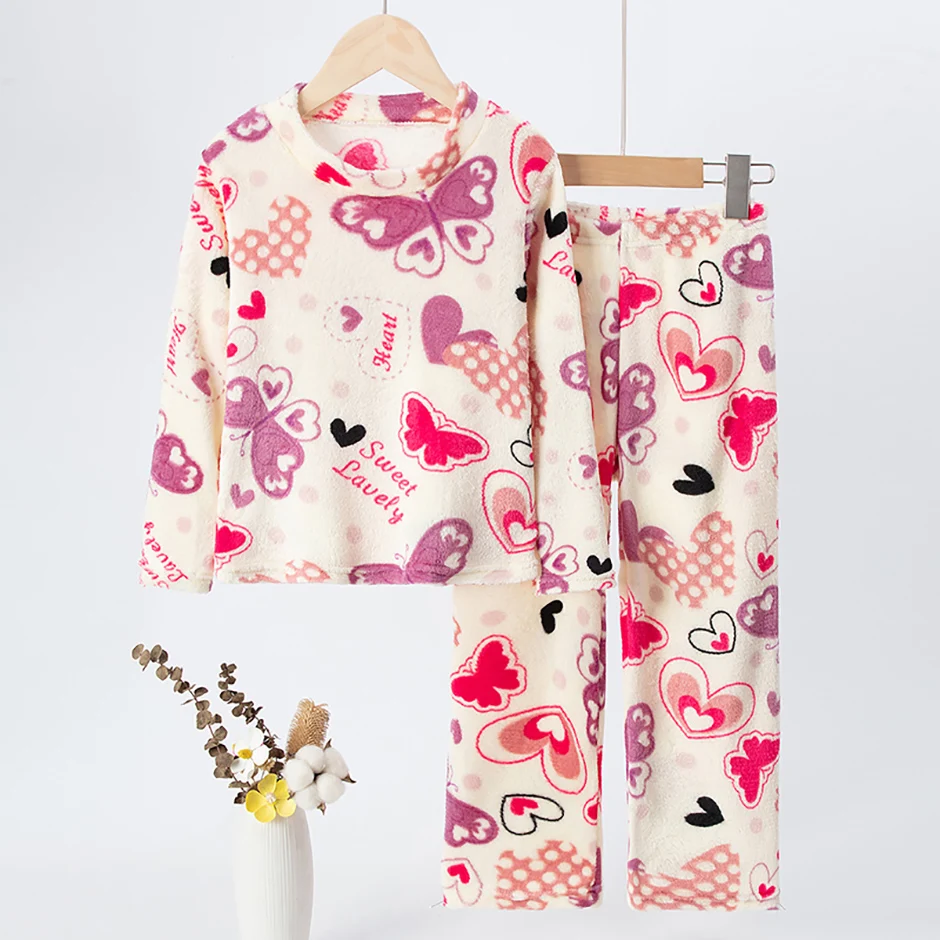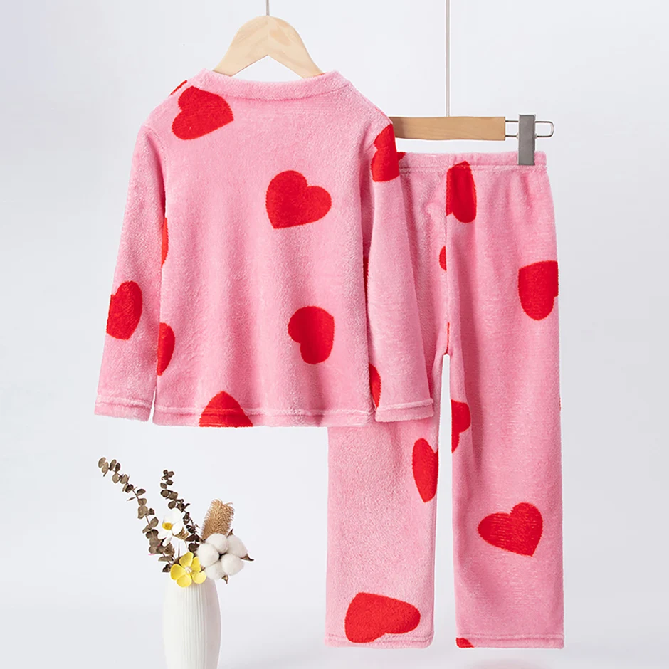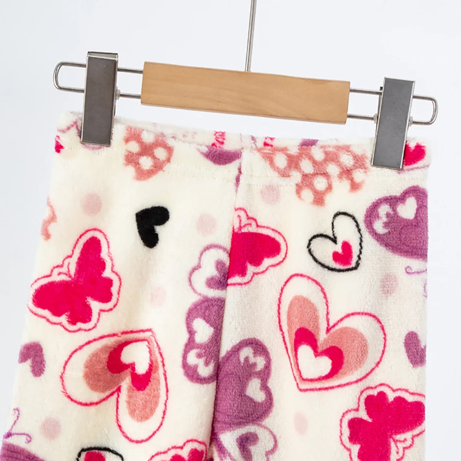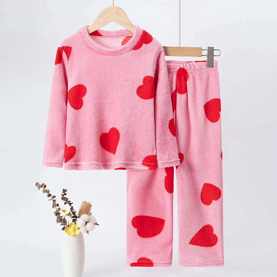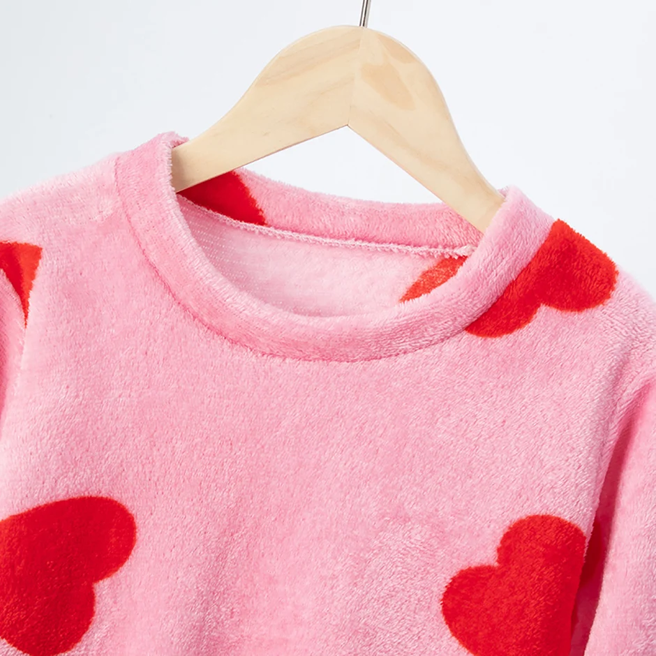 2-piece Children’s Autumn/Winter Flannel Fashion Print Set Girls’ Heart Warming Round Neck