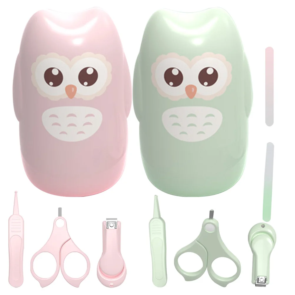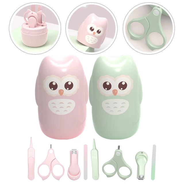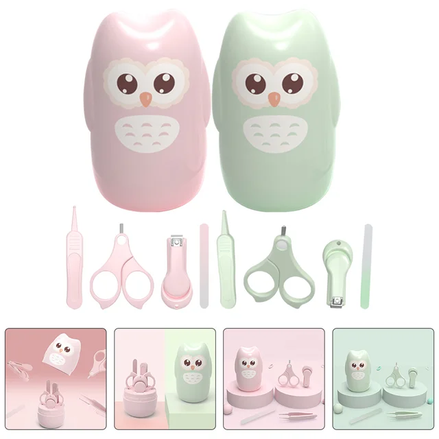 2 x nail clippers 2 x nail scissors 2 x tweezers 2 x nail files 2 x owl shape storage boxes