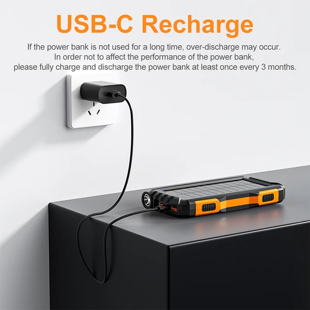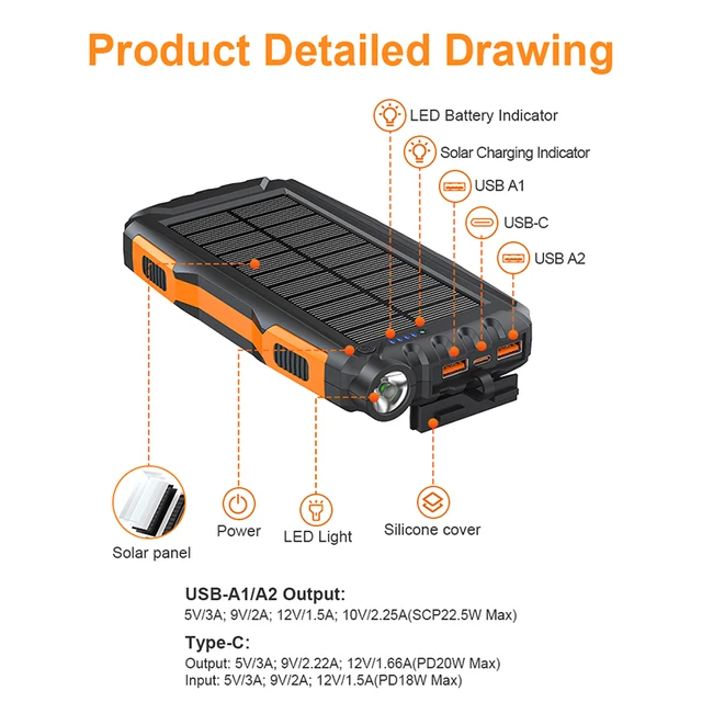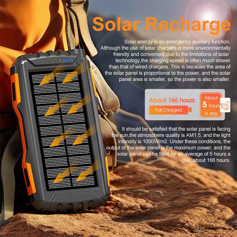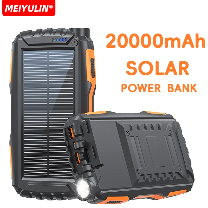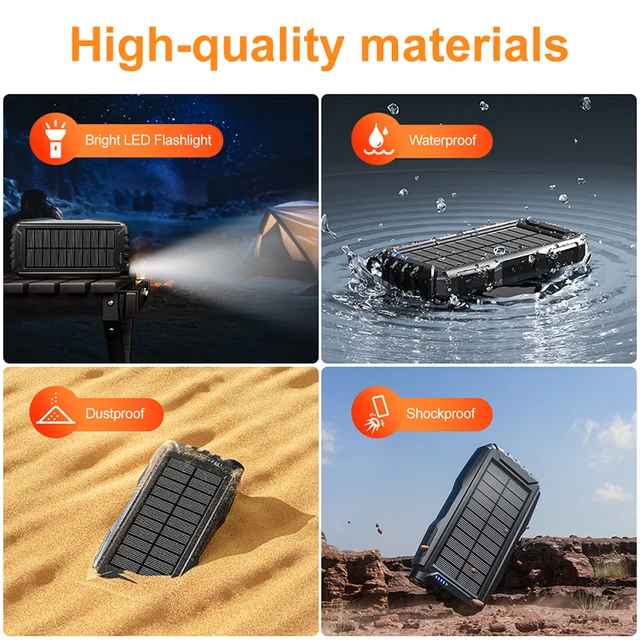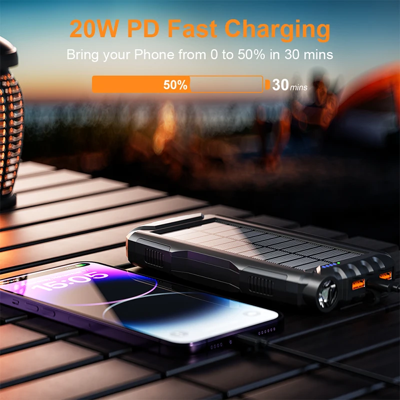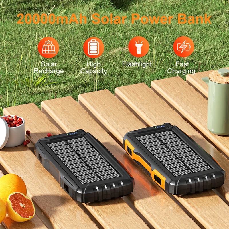 20000mAh Solar Power Bank Outdoor Charger Portable USB C Fast Charging External Battery LED Light for iPhone 17 Samsung Xiaomi