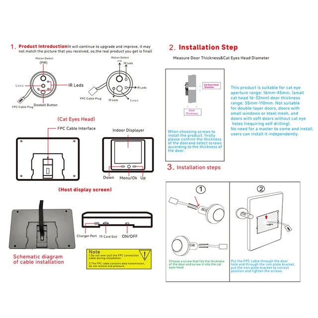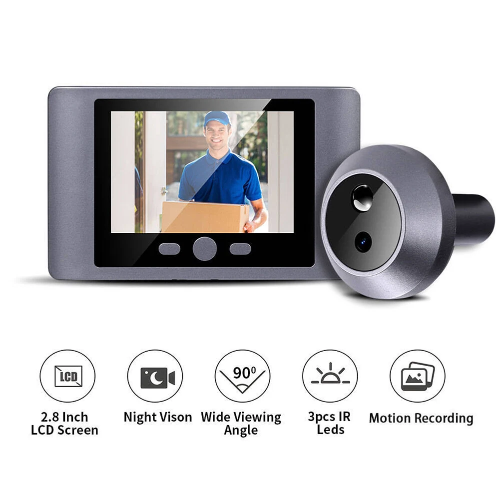 Feature: 1.Comprehensive Security Assurance: This Mini Peephole Smart Wireless Door Viewer Camera is equipped with a high-definition professional security camera, 90-degree ultra-wide-angle lens, automatic day-night mode switching, and a 2.8-inch TFT color LCD display. It supports photo taking, video recording, night vision, PIR motion detection, and human sensing features, providing your home with around-the-clock security. 2.Multi-Language Support: The Smart Peephole Video Doorbell supports multiple languages including Simplified Chinese, Traditional Chinese, English, and Russian. It is compatible with storage cards up to 128GB (not included), enabling high-definition image capturing and video playback, allowing you to easily manage home security data. 3.Long Battery Life & Easy Installation: The Front Door Peephole Camera comes with a 2000mAh high-capacity battery, offering up to 30 days of standby time. Its low-power design and USB-C charging port ensure lasting performance and easy charging, making installation more convenient. 4.Discreet Design: The Digital Door Viewer features a hidden peephole design to avoid neighborhood disputes, with no doorbell chime function. Additionally, it includes a ‘Do Not Disturb’ mode to enhance convenience and privacy. 5.Versatile Home Security Solution: This Digital Peephole Eye Viewer integrates PIR motion detection, night vision, language support, extended standby time, and user-friendly design, providing a comprehensive home security solution. Enhance entry point monitoring and ensure the safety of your family and home, giving you peace of mind.