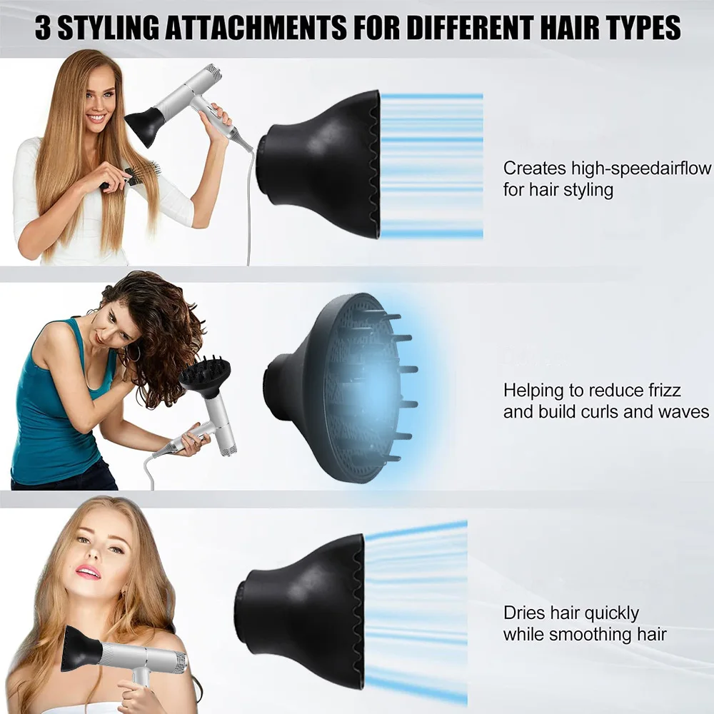 Versatile Usages: With three wind speed settings and three styling attachments, this hair dryer offers versatile options for all hair types. Whether you need a quick dry or precise styling, it delivers exceptional performance tailored to your needs.