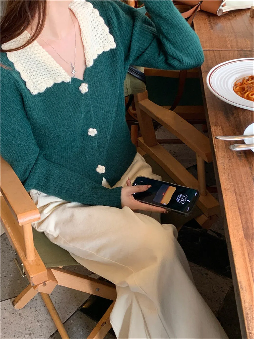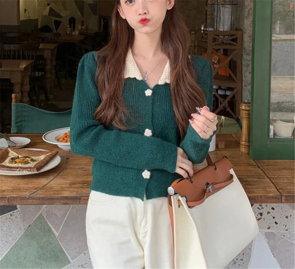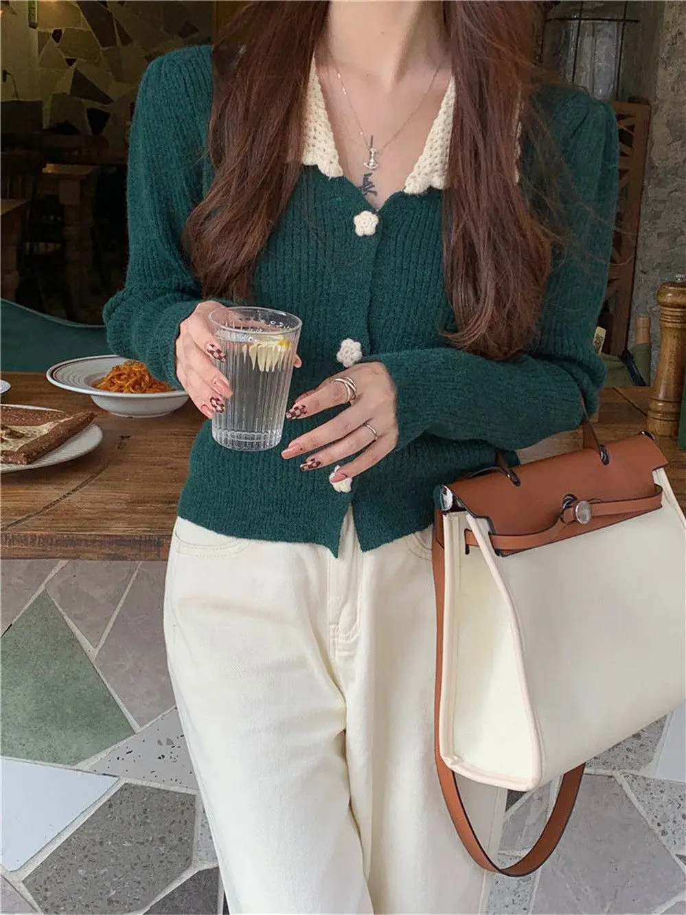 Elegant Solid V-neck Metal Buttons Women Knit Cardigan Fashion Slim Lantern Long Sleeve Sweater 2024 Autumn Female Chic Knitwear