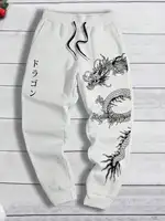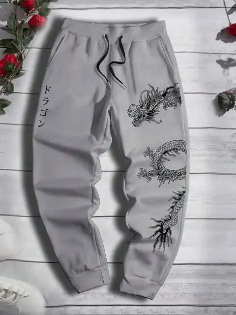 2024 Fashionable Men’s Dragon Pattern Printed Comfortable Fleece Drawstring Waist Versatile Spring