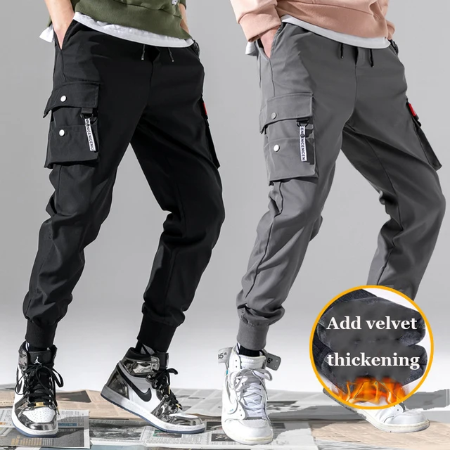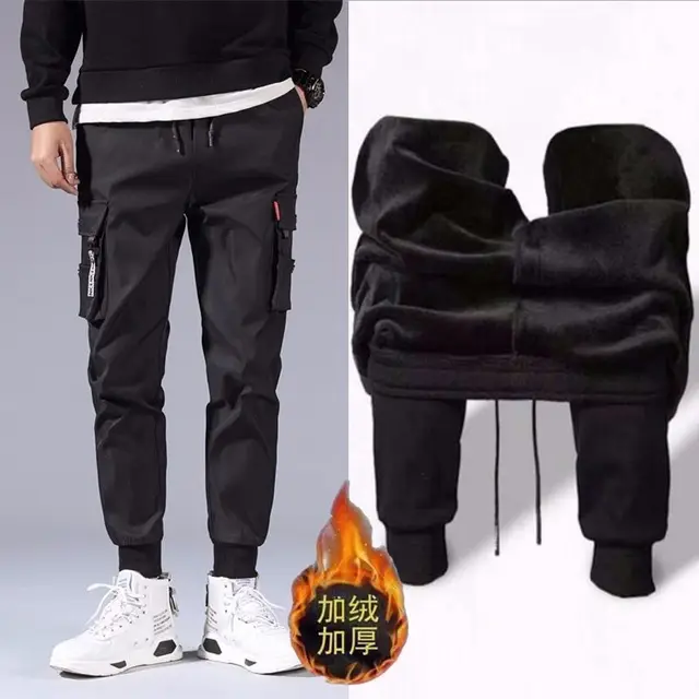2024 Men’s Trendy Casual Pants Winter Fleece Warm Trousers Multi Flap Pocket Cargo Pants High Street