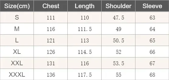 [Our Size 3XL] Bust: 135cm/53.15″, Shoulder: 51cm/20.08″, Sleeve: 69cm/27.17″, Length: 110cm/43.31″ (Approx.)