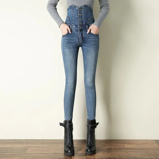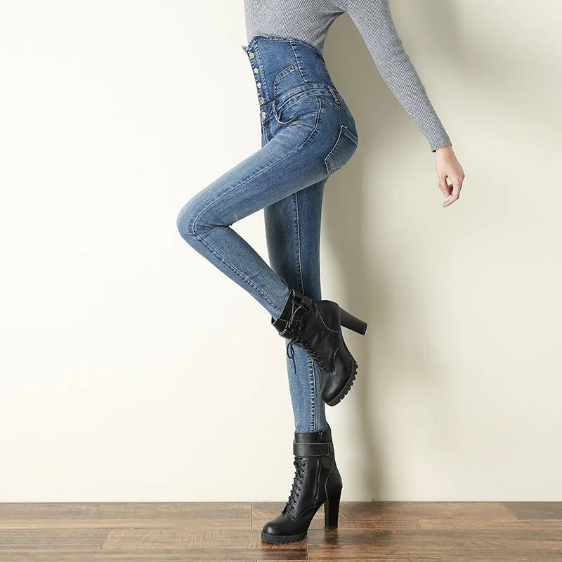 High-Waisted Fitted Jeans Women's Style European and American Cross-Border New Arrival Five-Button Wide Waist Design