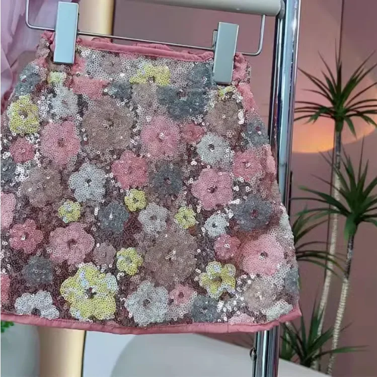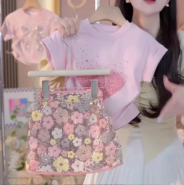 2024 Summer New Children’s Short Sleeve T-shirt Sequined Skirt 2-piece Set Women’s Fashionable