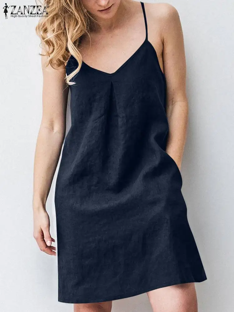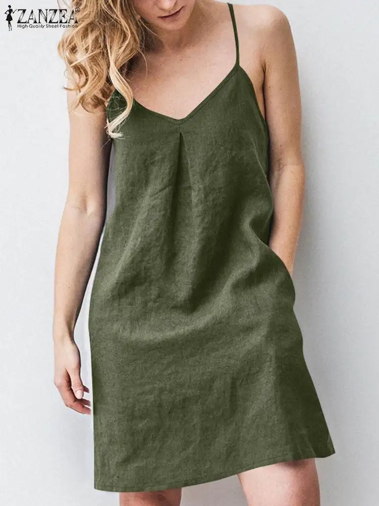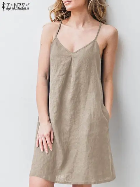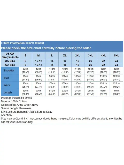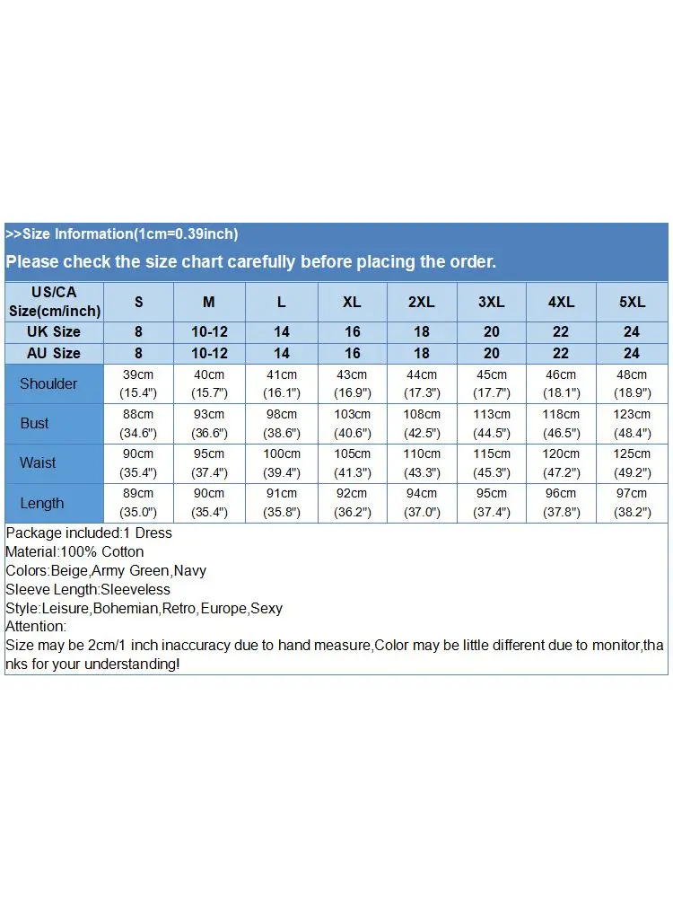 | Package included:1 Dress Material:100% Cotton Colors:Beige,Army Green,Navy Sleeve Length:Sleeveless Neckline:V-Neck Pattern:Solid Color Length:Knee Length Thickness:Thin Features:Adjustable shoulder strap length Style:Leisure,Bohemian,Retro,Europe,Sexy Season:Spring,Summer,Autumn Occasion:Family,Party,Wedding,Holiday,Employment Attentions: 1.The Real Object May Exist Slightly Colors Differences Compared To Images As Different Computers Display.Caution If Minding,Thanks. 2.There Might Be A Manual Measuring 1-3 cm Error.Sorry For Any Inconvenience. 3.Please Prevail On Real Item, Model Images For Reference Only. 4.Attention!!!Please check the size chart carefully before placing the order.