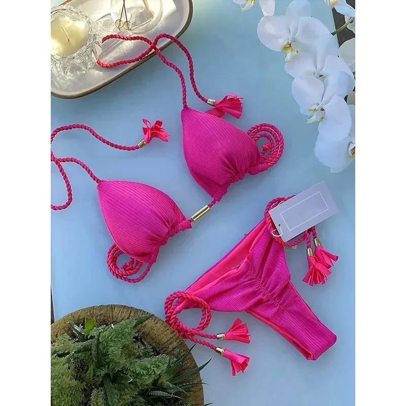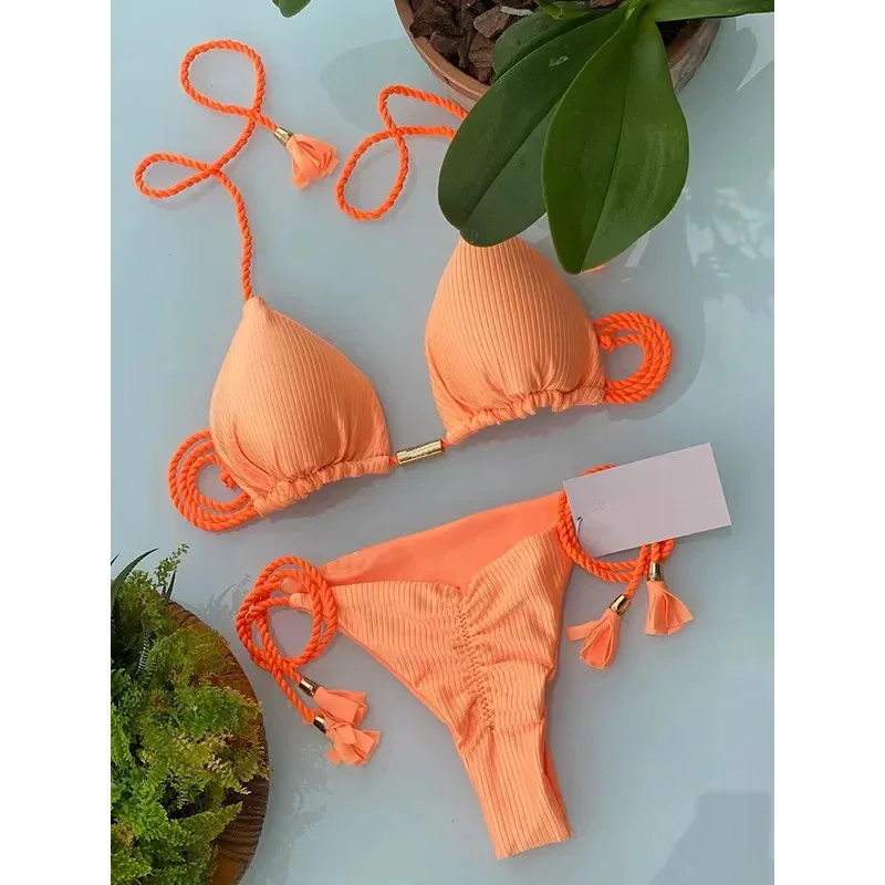 2025 2025 New Women Ribbed Bed Swimsuit Sexy Swimwear Micro Thong Bandage Bathing Suits Halter Brazilian Biquini Bikinis