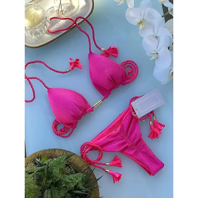 2025 2025 New Women Ribbed Bed Swimsuit Sexy Swimwear Micro Thong Bandage Bathing Suits Halter Brazilian