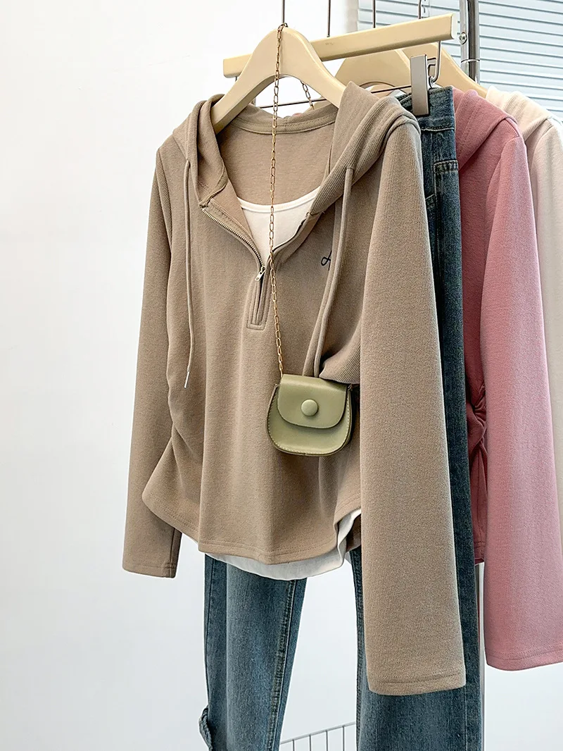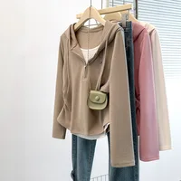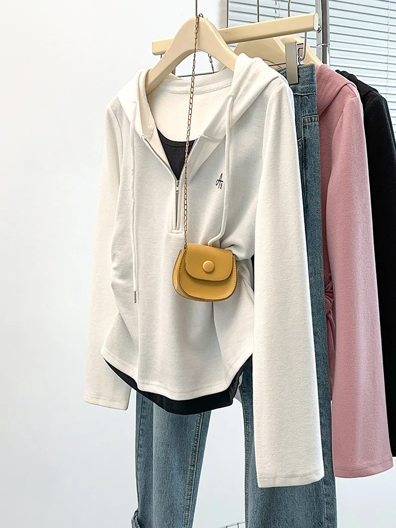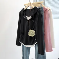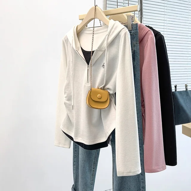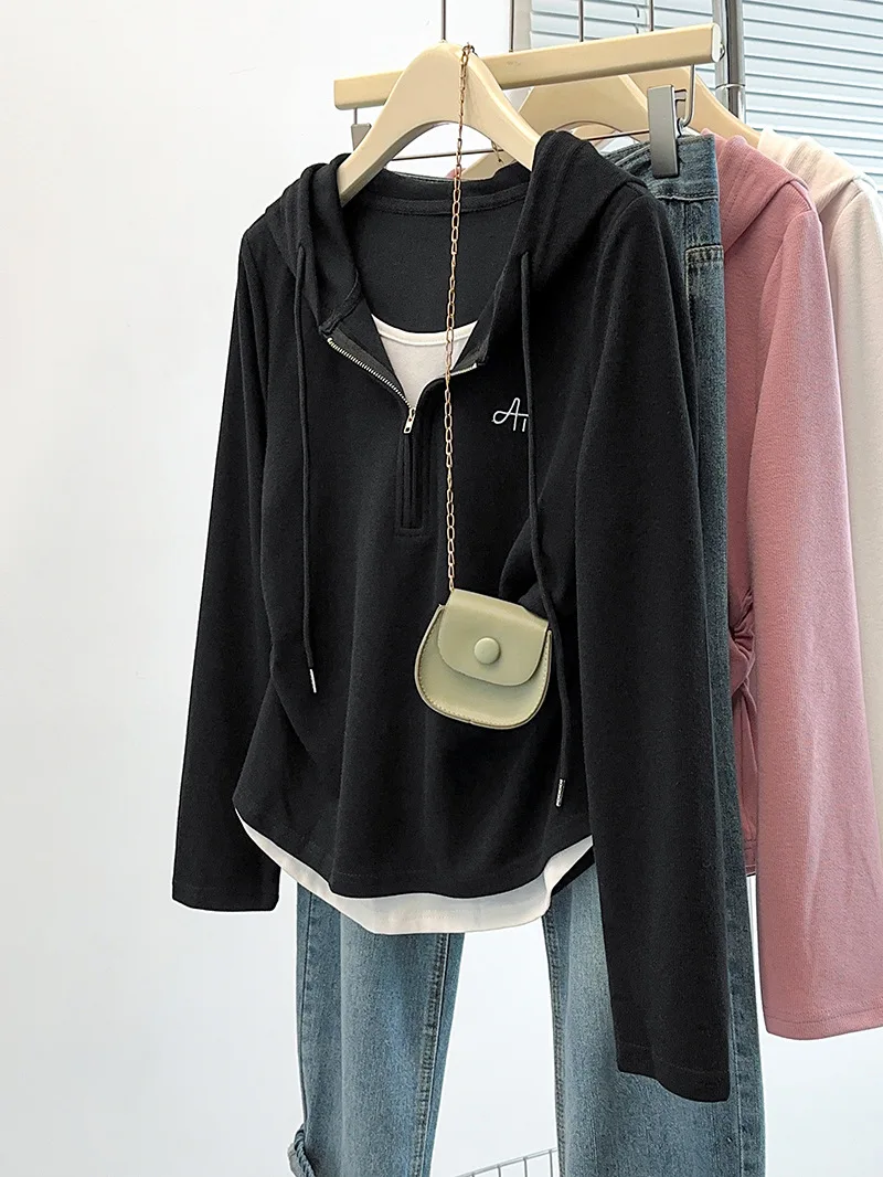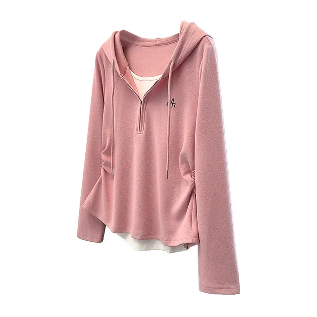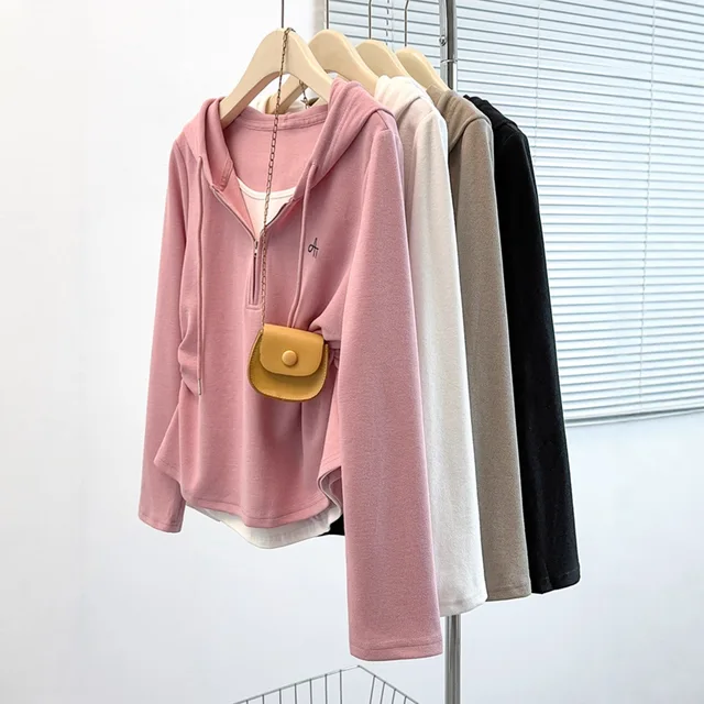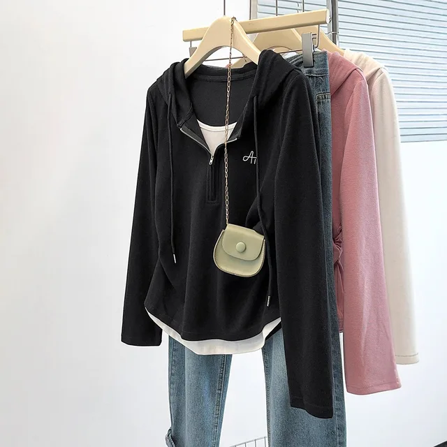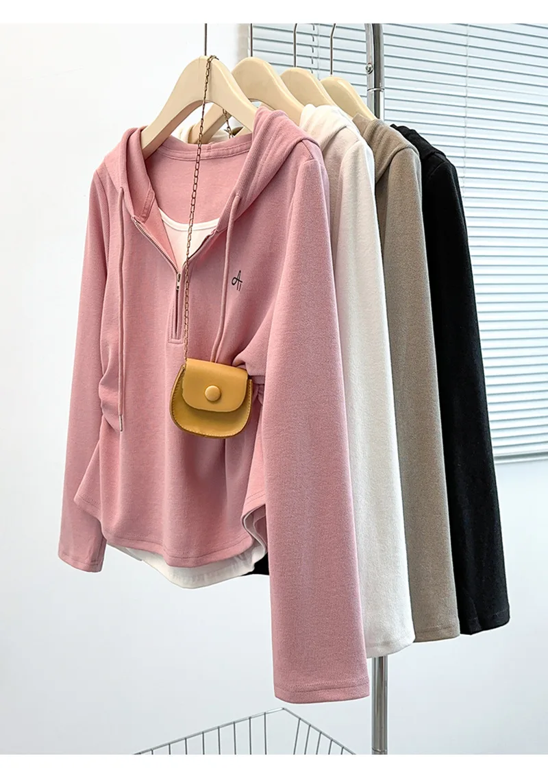 The 2025 Autumn New Style Fat MM Plus Size Women’s Color Block Faux Two-Piece Hooded Long Sleeve Sweatshirt Top features a bold color block pattern, adding a trendy touch to your wardrobe.