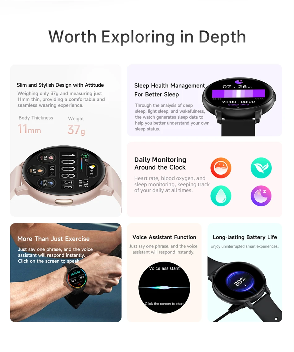 Heart rate monitoring, blood oxygen monitoring, sleep monitoring, respiration monitoring, calling, music, voice assistant, remote photography, message notification, reminder notification, screen up, alarm clock, stopwatch, weather, calculator, walking, running, cycling, mountaineering and other sports types, dynamic dial, local dial, online dial, dial customization, album dial, multiple sports modes
