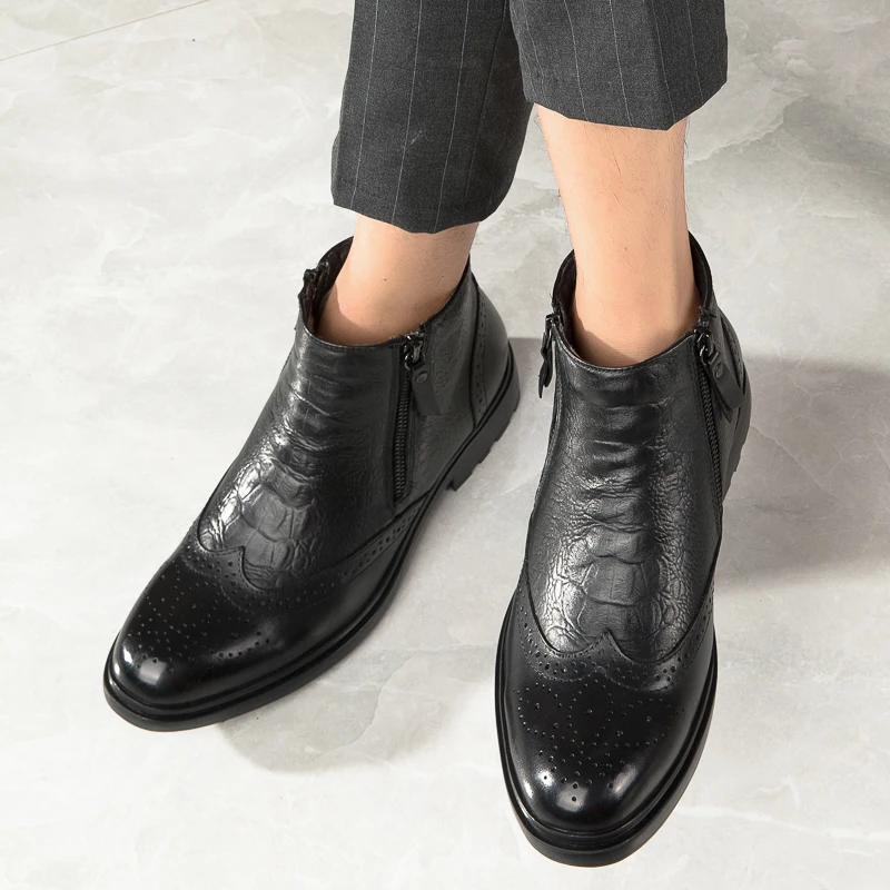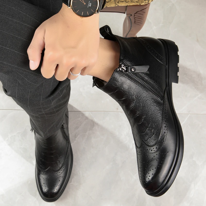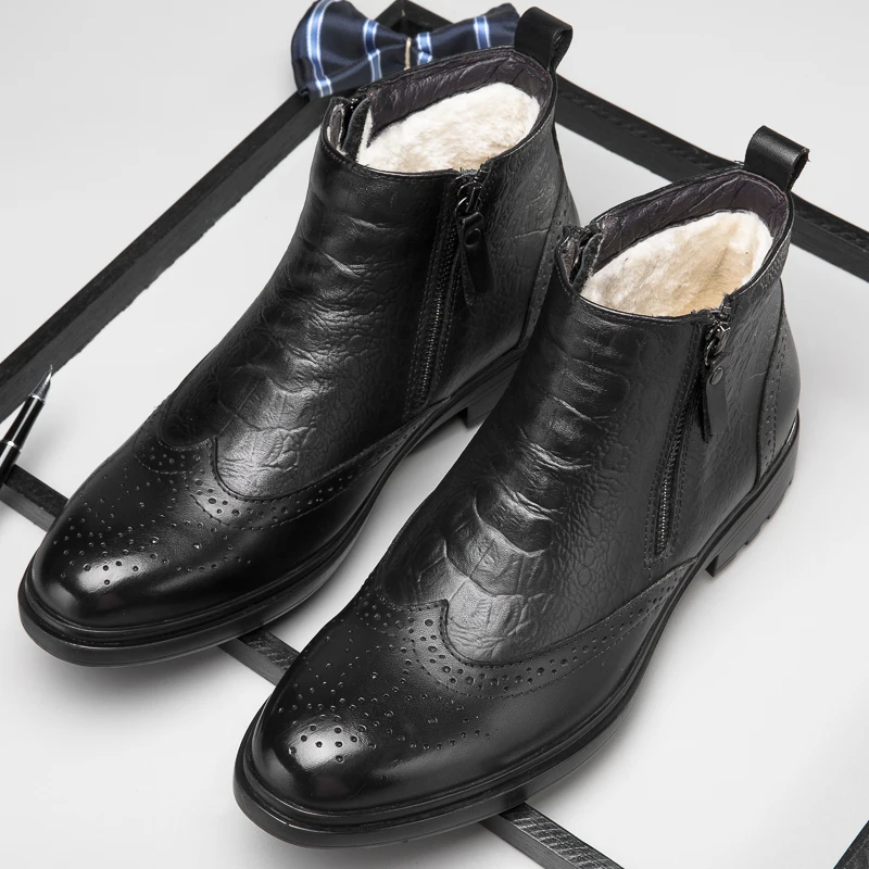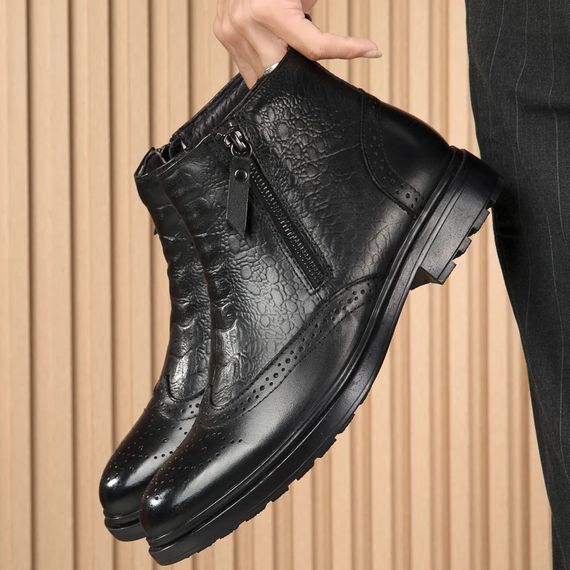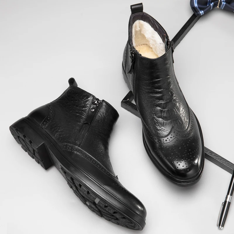 2025 Men Winter Plush Snow Boots Genuine Leather Men Side Zipper Ankle Boots Fashion Men Casual Low Top