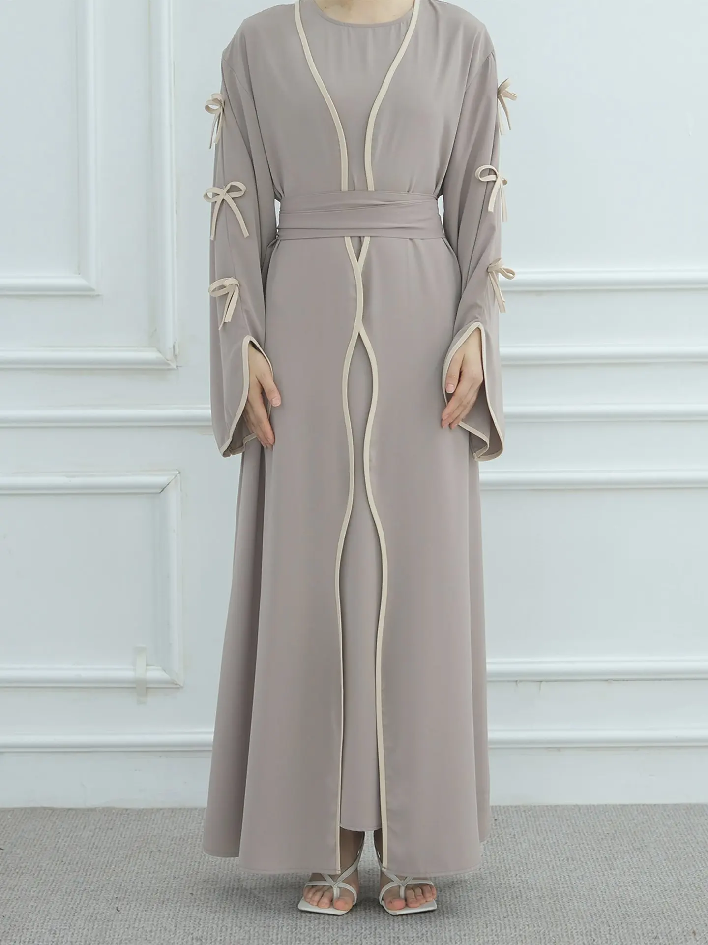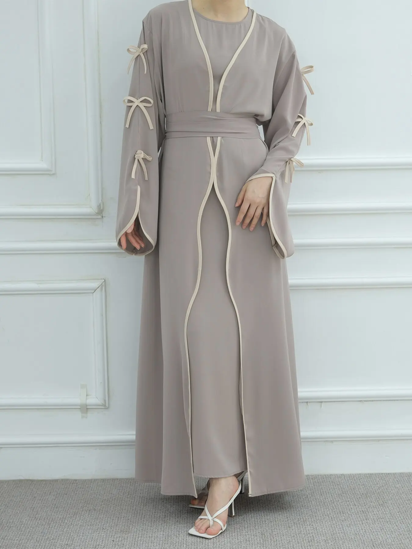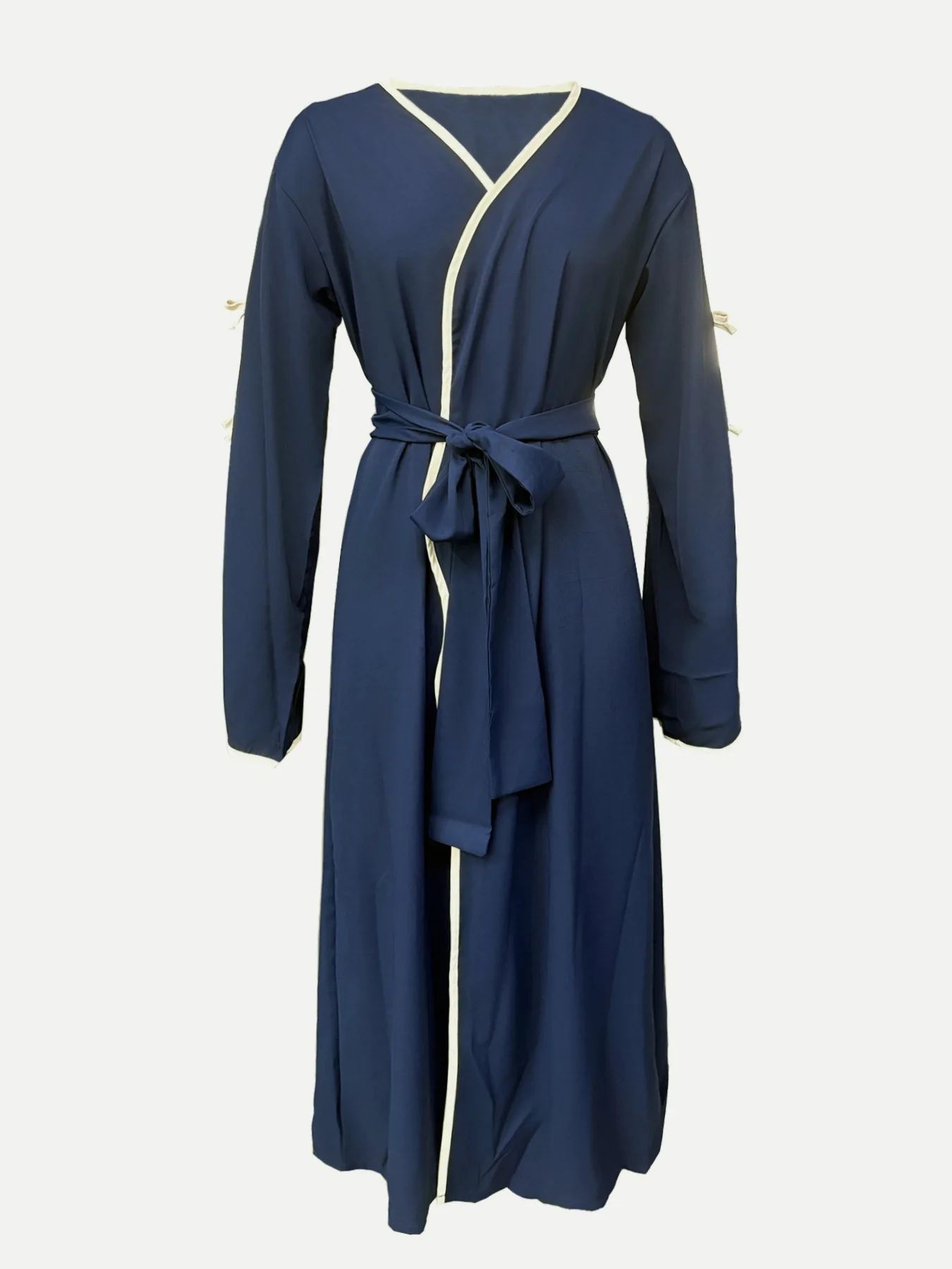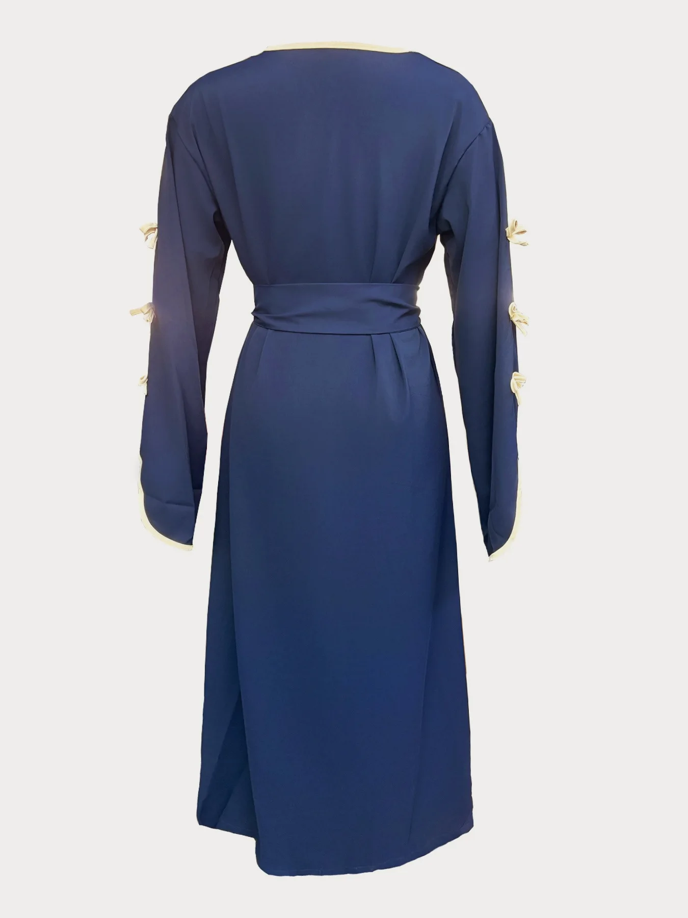 The belted design featuring bow detailing adds a touch of elegance and femininity to this modest dress.